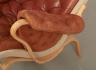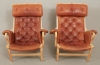 Ett par, stomme i bok, klädsel i läder, (en fåtölj med skada i klädsel - se bild). Brännmärkta, bruksslitage.