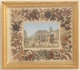 Vy över Dresden, kantad av broderi, samt collage med blommor m.m. Daterad 1855. Rammått 30 x 34,5 cm.