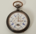 Diameter 65 mm, fungerar, visare för datum, veckodag, månad, månfas, Emaljskada kl 1. Gravyr. Schweiz ca: 1900.