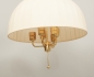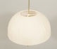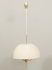 Taklampa, stomme. i mässing, skärm i textil (fläckig), 6 elektriska ljuspunkter, diam ca 55 cm, ej funktionstestad.