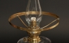 Mässingsfot, oljehus i slipat glas, funktionsduglig, brännrörshöjd 46 cm. Fint skick.