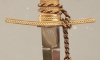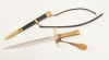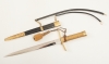 Förgyllt fäste, greppet lindat med förgylld tråd, tre kronor på knoppen, blankpolerad klinga, 18 mm bredd, 229 mm läng, instansat E.G-s, Svart läderbalja med förgyllda beslag, totallängd 335 mm, Flygvapnets portepé