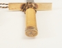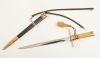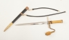 Förgyllt fäste, greppet lindat med förgylld tråd, tre kronor på knoppen, blankpolerad klinga, 16 mm bredd, 239 mm lång, etsad hjälm över "WKC" och därunder "Solingen", svart balja av skinklädd glasfiber med förgyllda beslag, totallängd 360 mm, flygvapnets portepé m/30.
