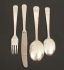 48 delar, 12 st gafflar, längd 17 cm, 12 st skedar, längd 16,5 cm, 12 st skedar, längd 19 cm, 12 st knivar, längd 22 cm, bruksslitage, gravyrer