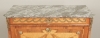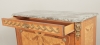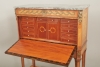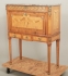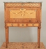 Toppskiva i marmor, lådor samt utfällbar skrivskiva med bakomliggande inredning. Fanerad med olika träslag, dekor av intarsia samt bronserade beslag. 100 x 42, höjd 120 cm.