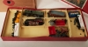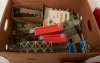Stolpar, övergångar, bro, pultar varav många i originalkartong, 2 st transformatorer, äldre låda Märklin med vagnar samt lok, broschyrer m.m.