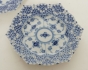 Helblond, med dubbel genombruten dekor i kant. Diam 17,5 cm, II:a sortering, smärre bruksslitage