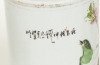 1900-tal, emaljfärgsdekor, med pioner och fåglar, höjd 28 cm, smärre bruksslitage, men dekorslitage på övre dekorrand. Daterad i text.