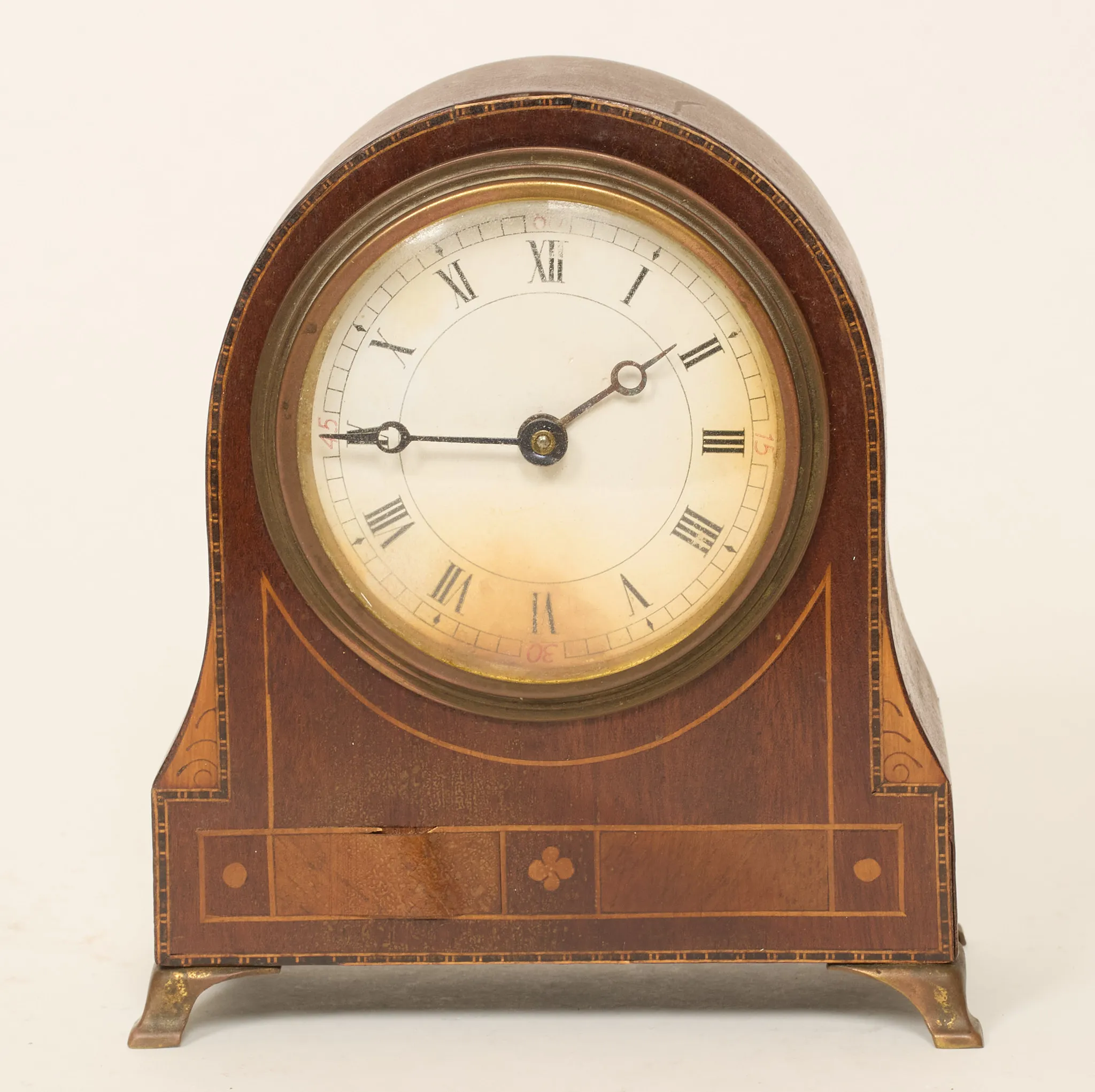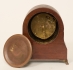 Mahogny med intarsia, höjd 18 cm, bruksslitage, fanérskador, fungerar ej.