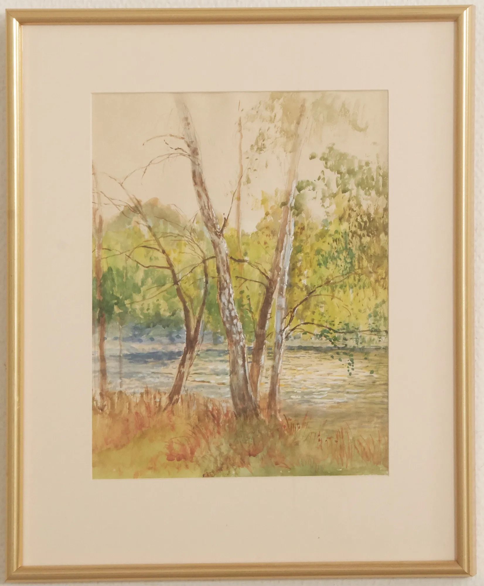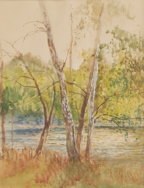Vy över björkar och vatten, osignerad, men dotter intygar på baksidan, bildmått 31 x 24 cm. Ej examinerad ur ram.