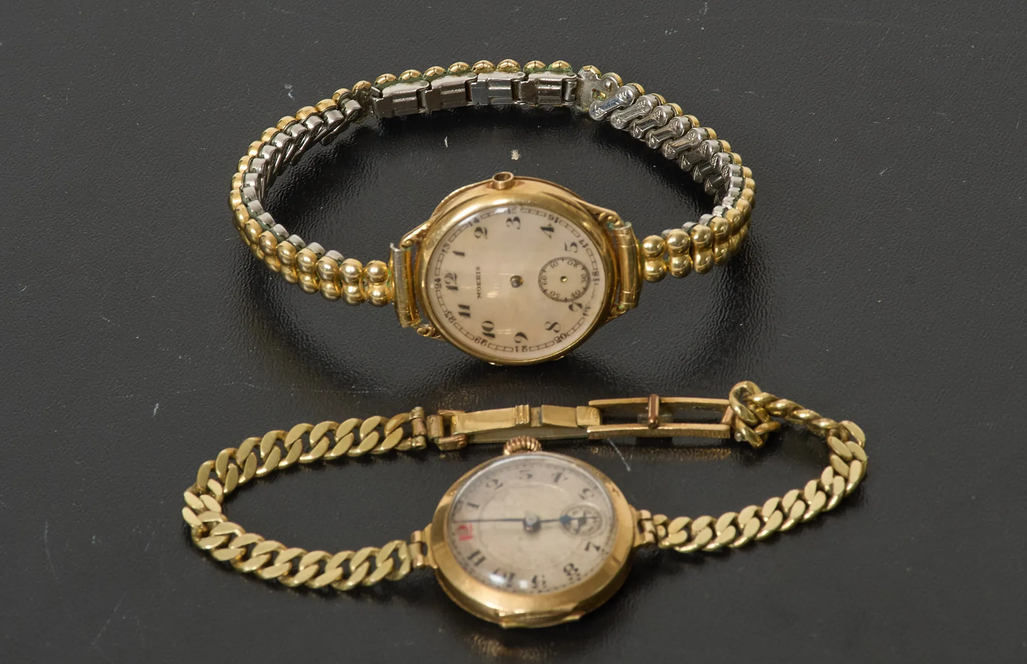2 st, 14-k guld i boetten, länk i gulddouble, defekta ur, tot. vikt 37 gram