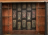 2-delat, överdel med dörrpar, samt snurrbar förvaring, 88 x 49 cm, höjd 169 cm, bruksslitage. Defekt lås.