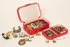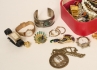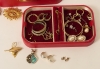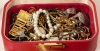 Ett par örhängen 18-k guld (en snurrebuss utbytt till silver). Halsband, örhängen broscher m.m. Ej genomgånget.