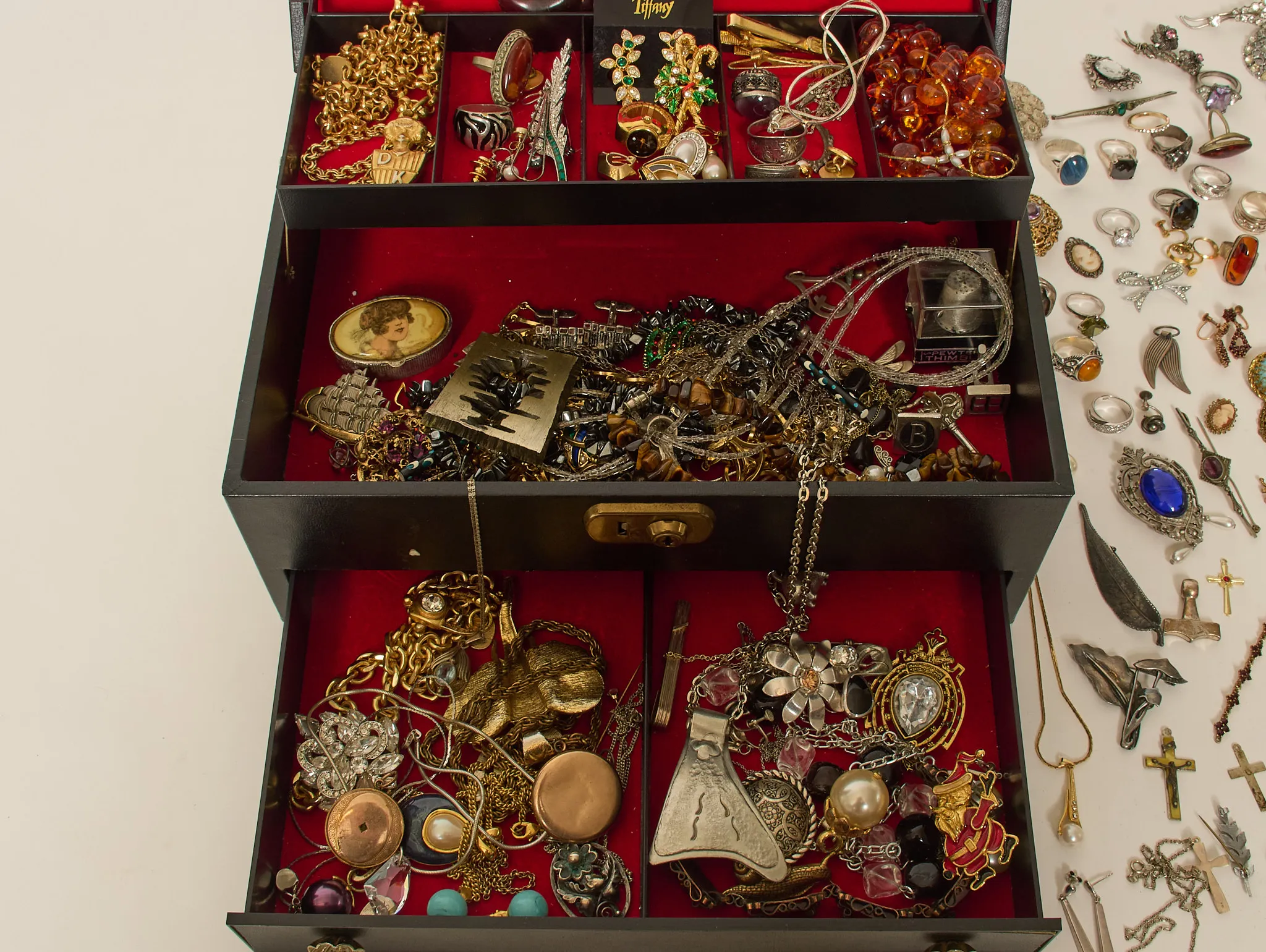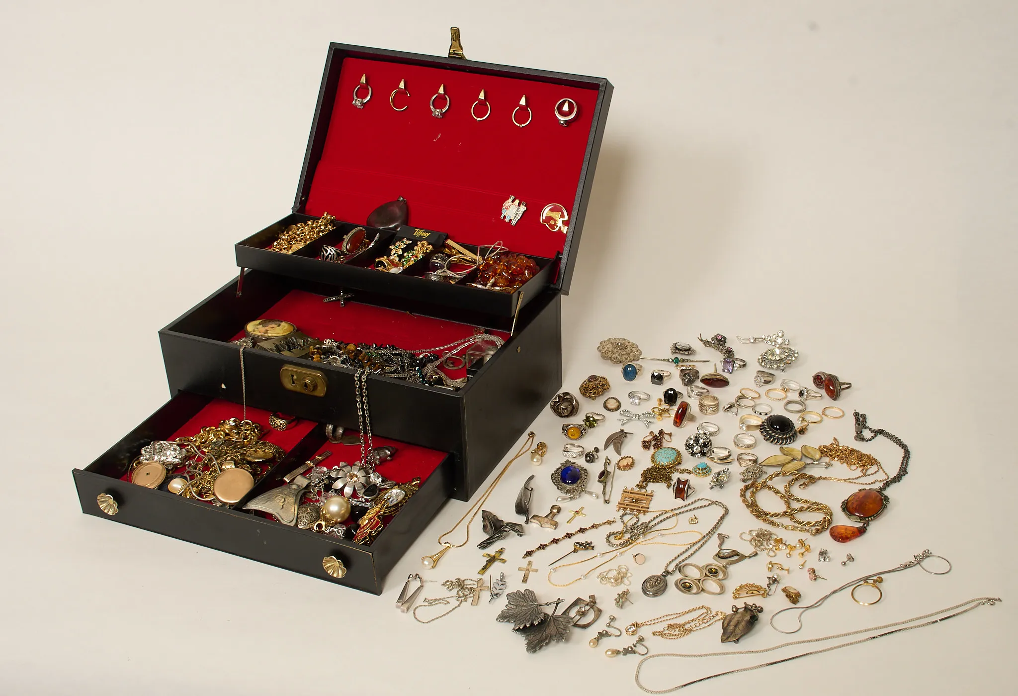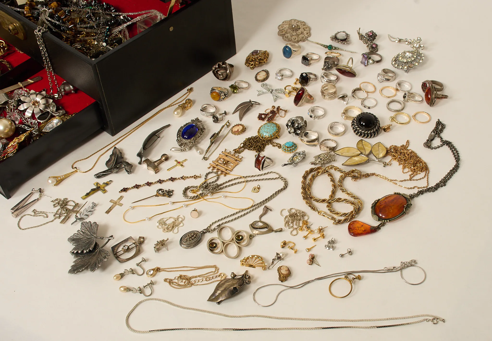 Stort parti, ringar, broscher, halsband, örhängen m.m. Äldre samt nyare, bärnsten, samt silver förekommer.Ej fullständigt genomgånget.