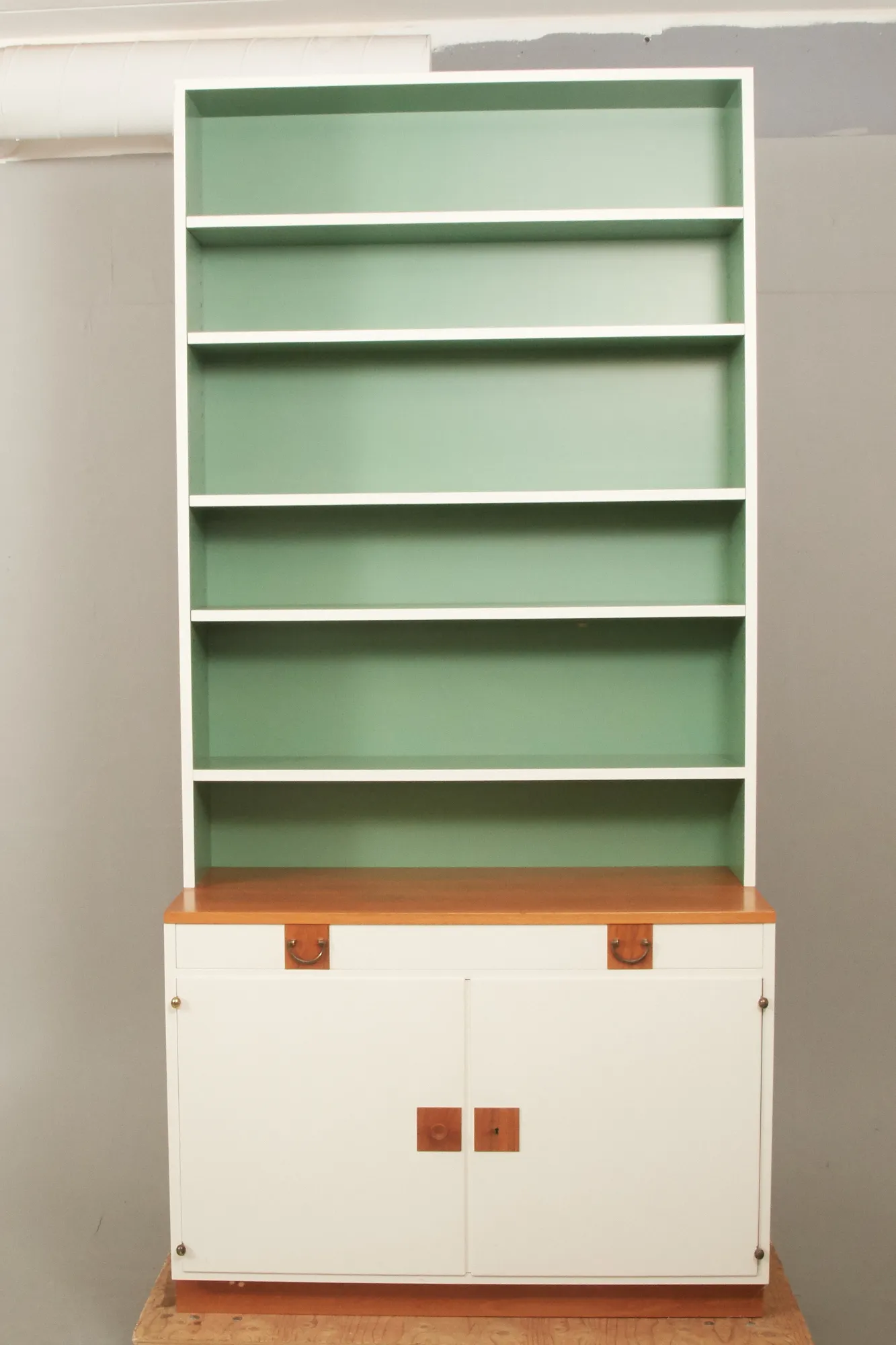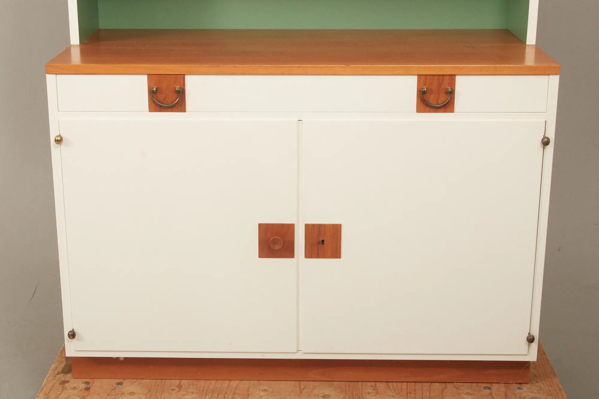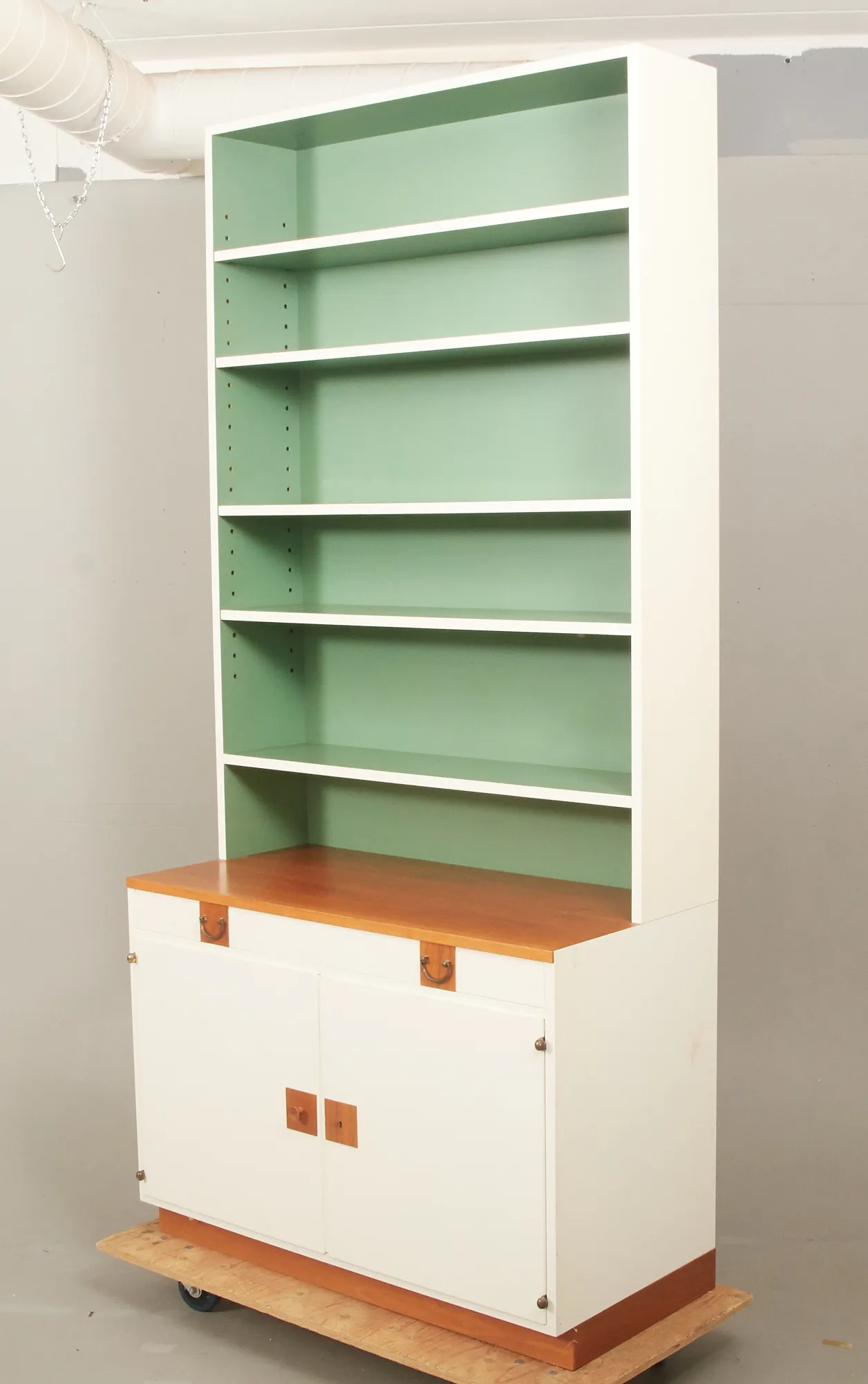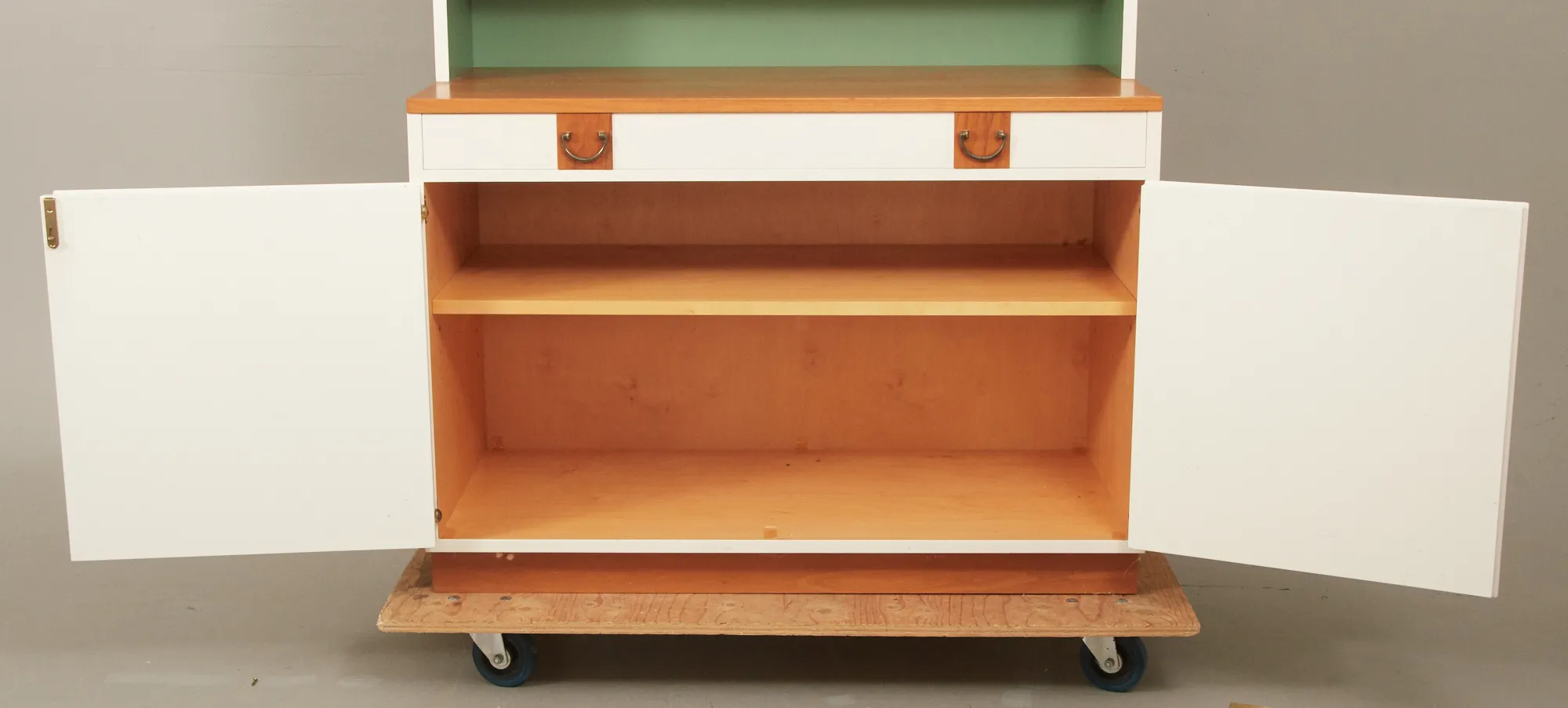 Modellnr B2255, 2-delad, bemålad, vitlackerat med grönmålad fond, låsbrickor i valnöt med mässingsbeslag, en utdragslåda, samt dörrpar. 106 x 51 cm, höjd 75/225 cm. Smärre bruksslitage, men mindre repor/märken förekommer, en dörr något skev, saknar nyckel.