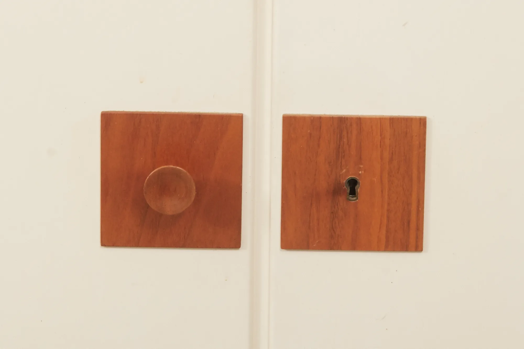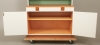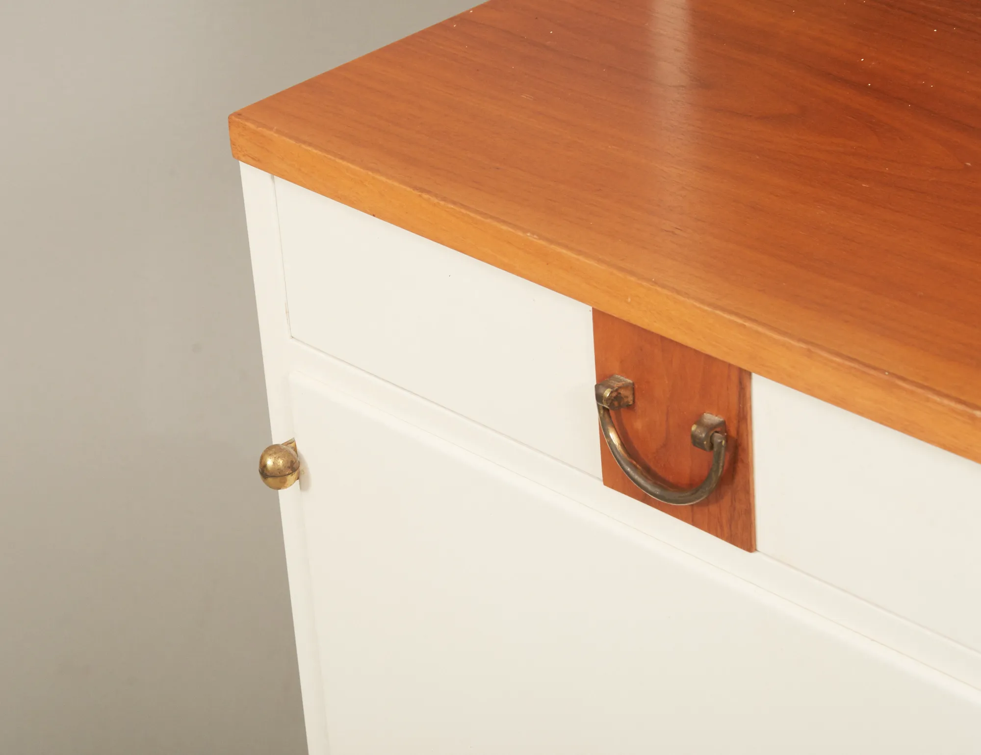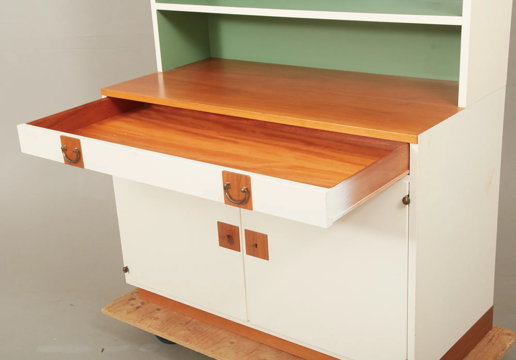 Modellnr B2255, 2-delad, bemålad, vitlackerat med grönmålad fond, låsbrickor i valnöt med mässingsbeslag, en utdragslåda, samt dörrpar. 106 x 51 cm, höjd 75/225 cm. Smärre bruksslitage, men mindre repor/märken förekommer, en dörr något skev, saknar nyckel.