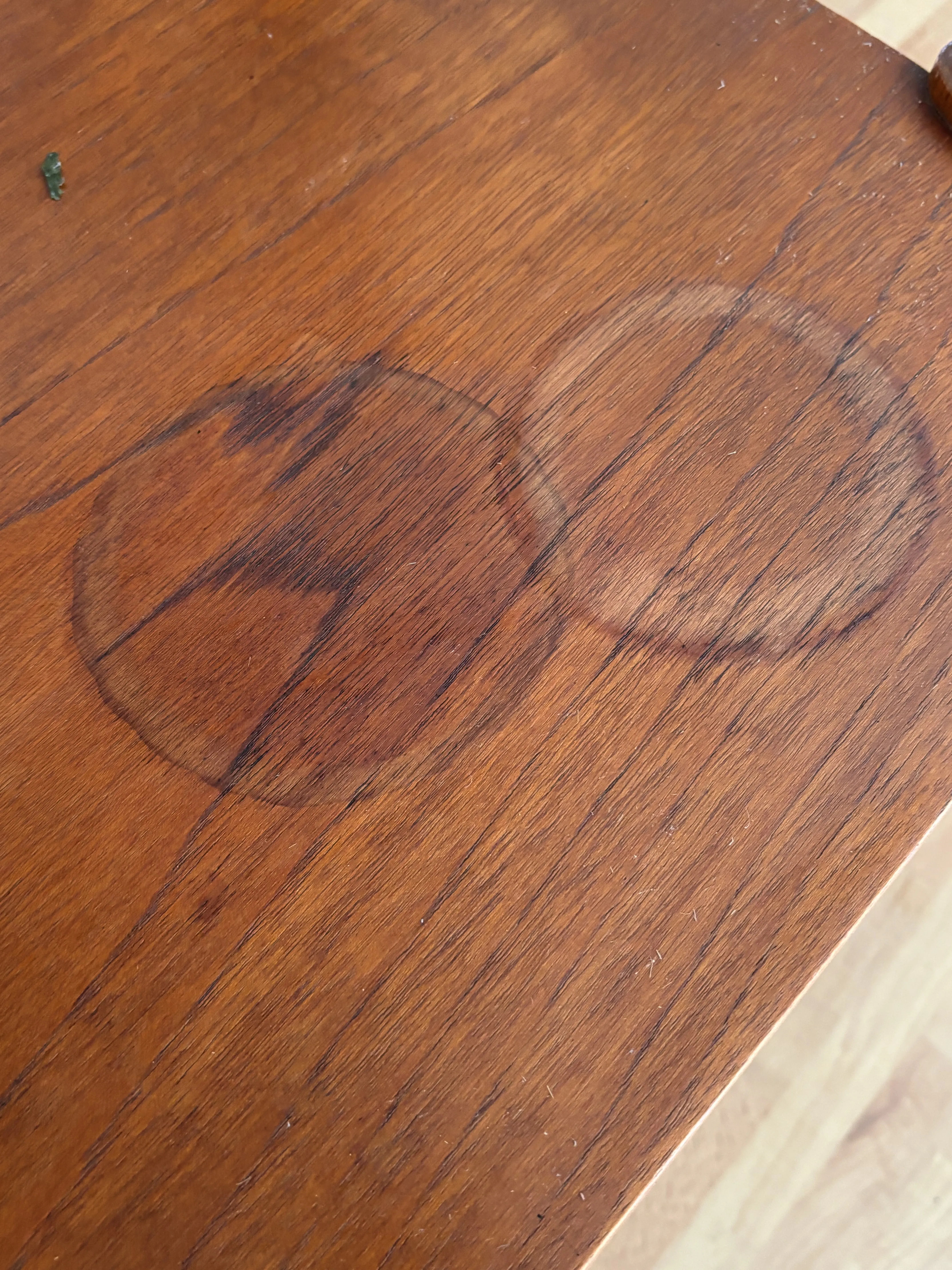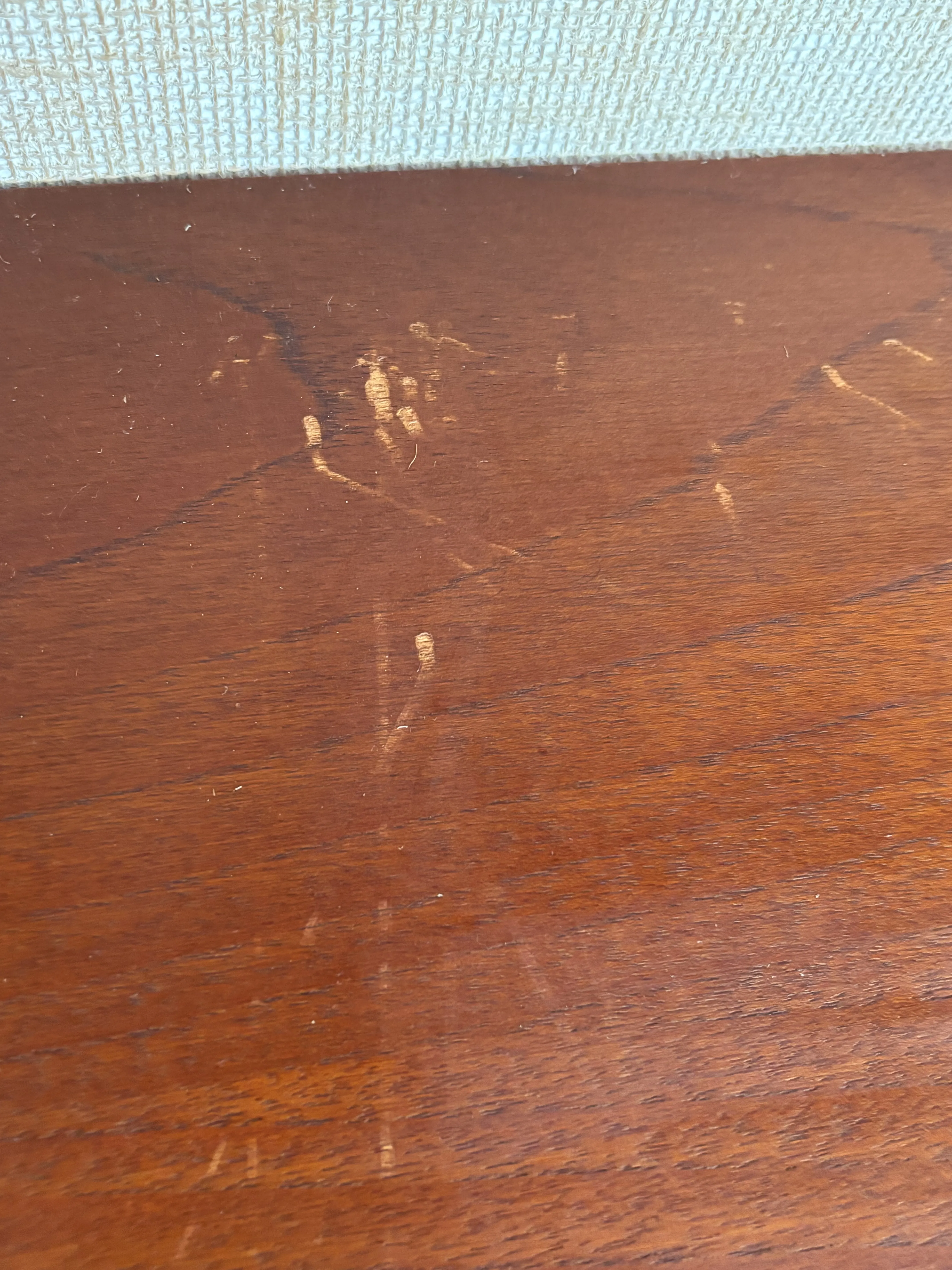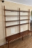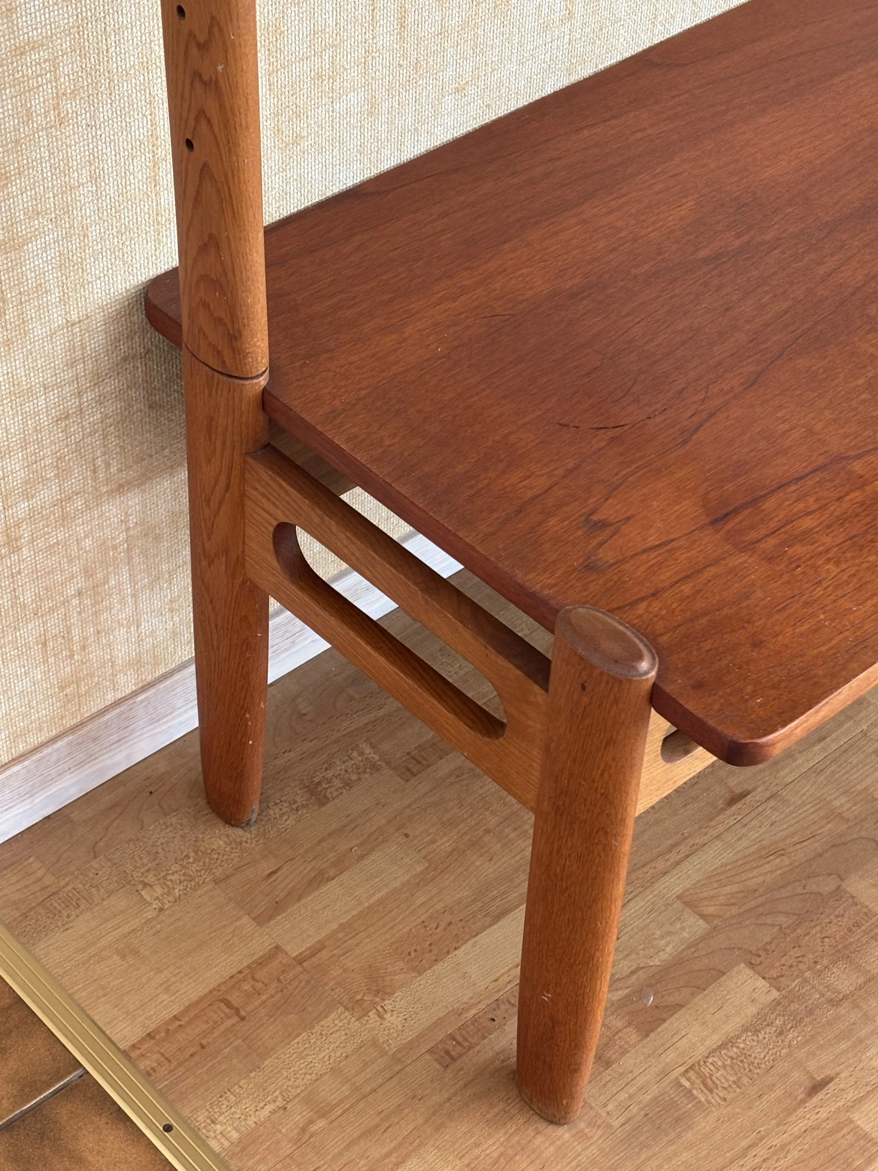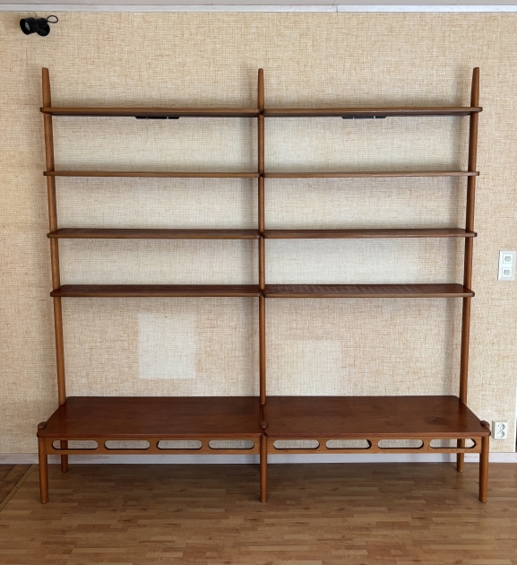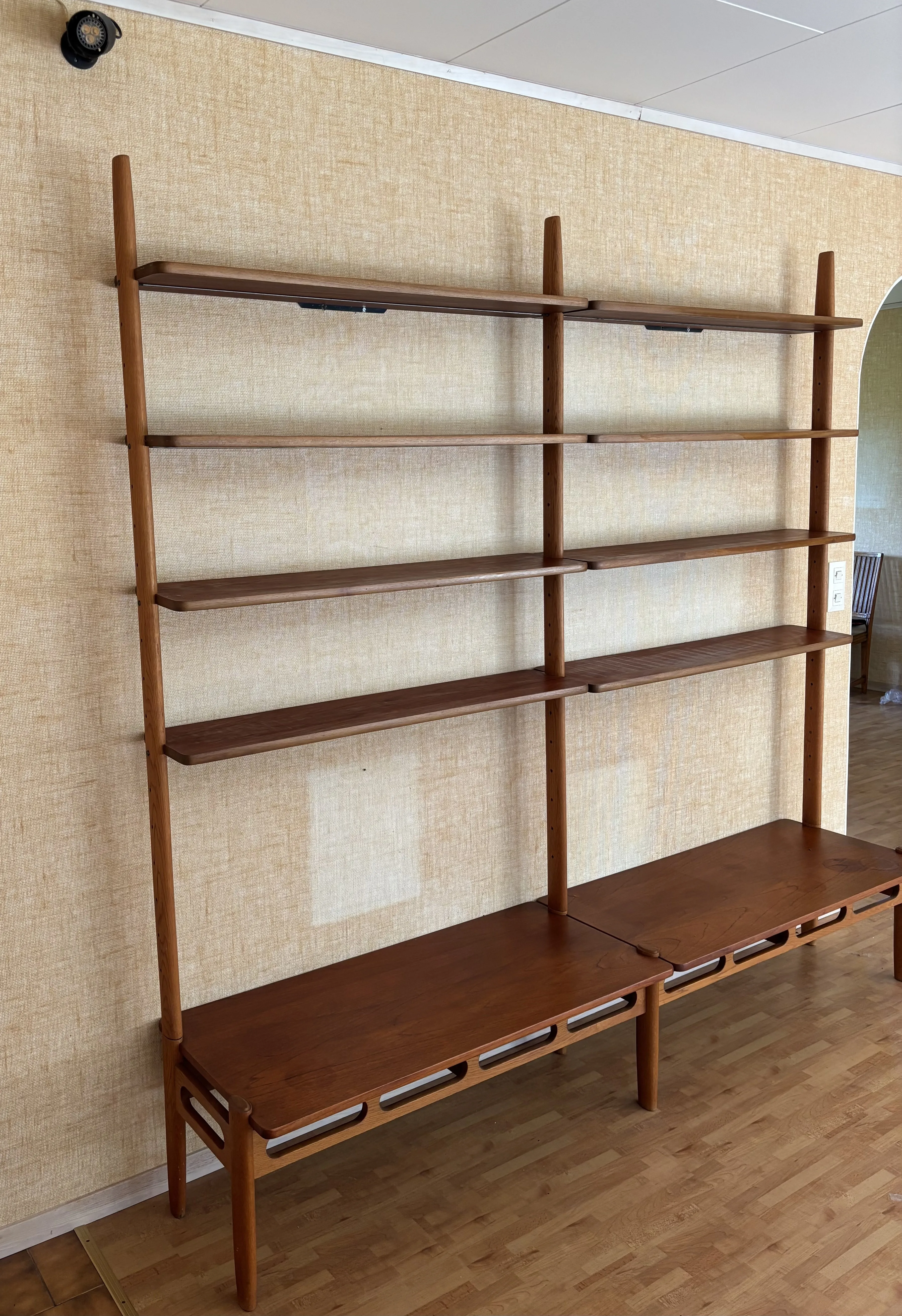 För A/S Mikael Laursen, Århus, Danmark, teak, bredd 214 cm, djup 48/22 cm, höjd 207 cm, smärre bruksslitage, men en stor skiva med märken.