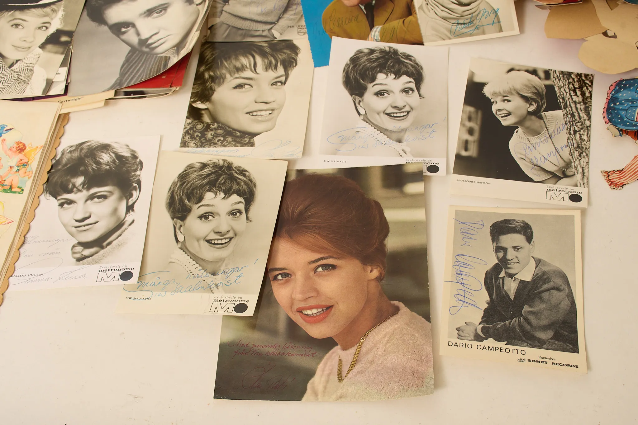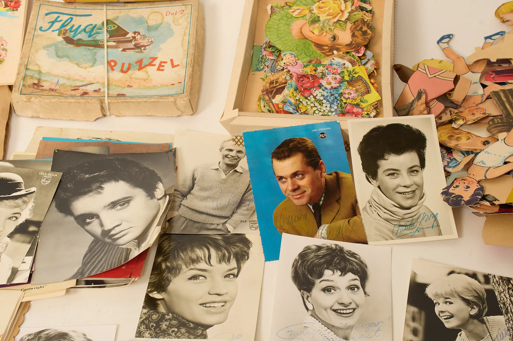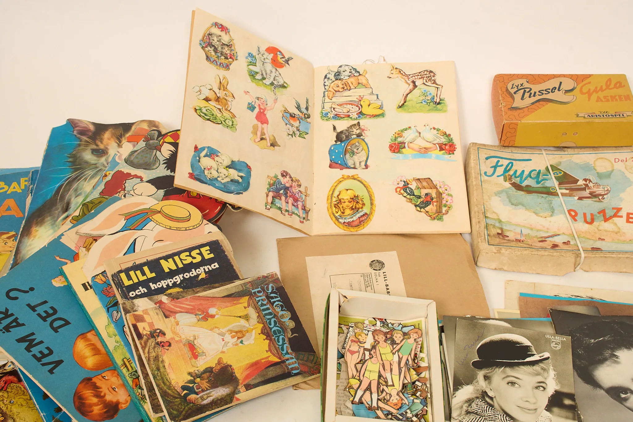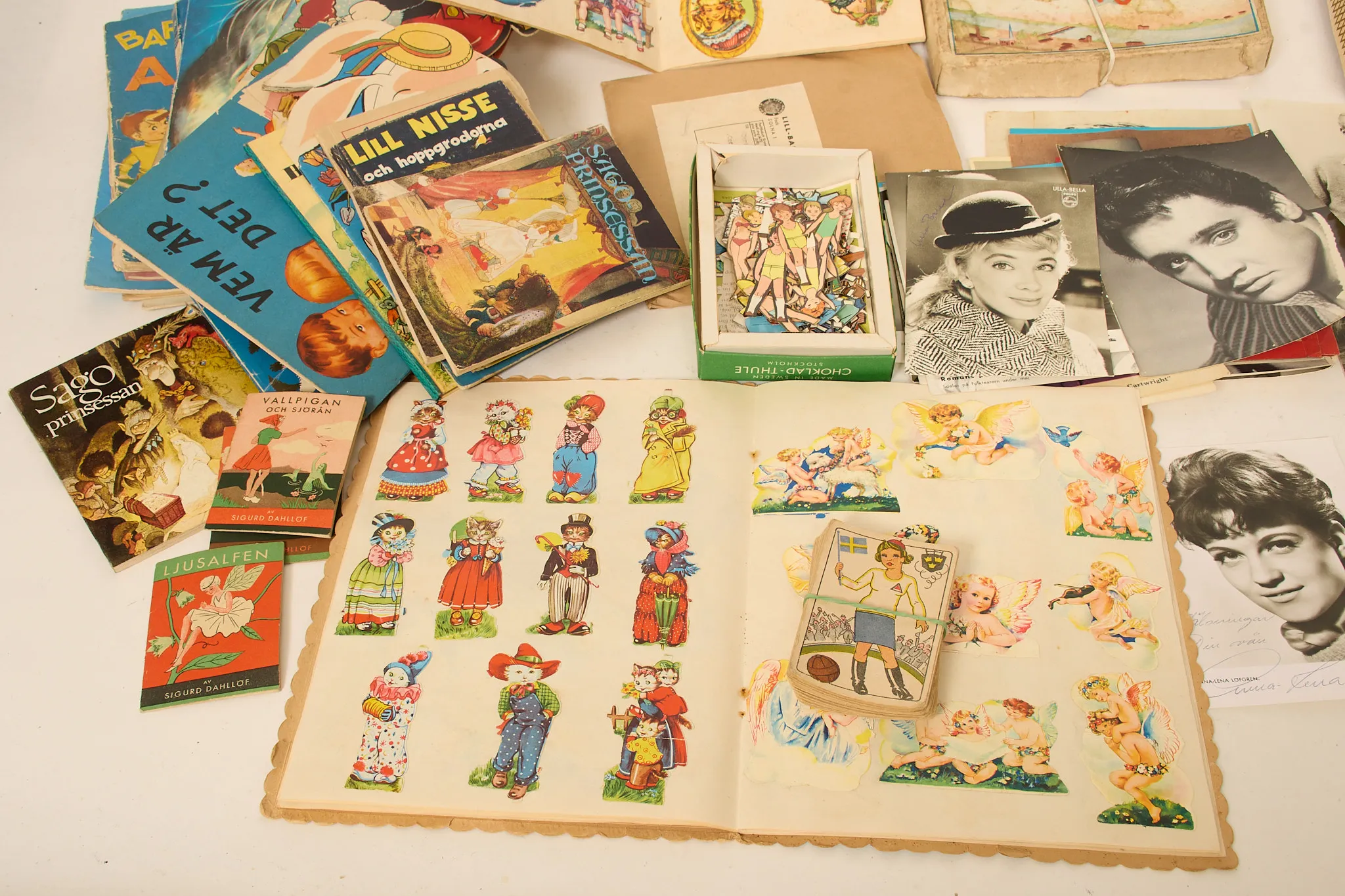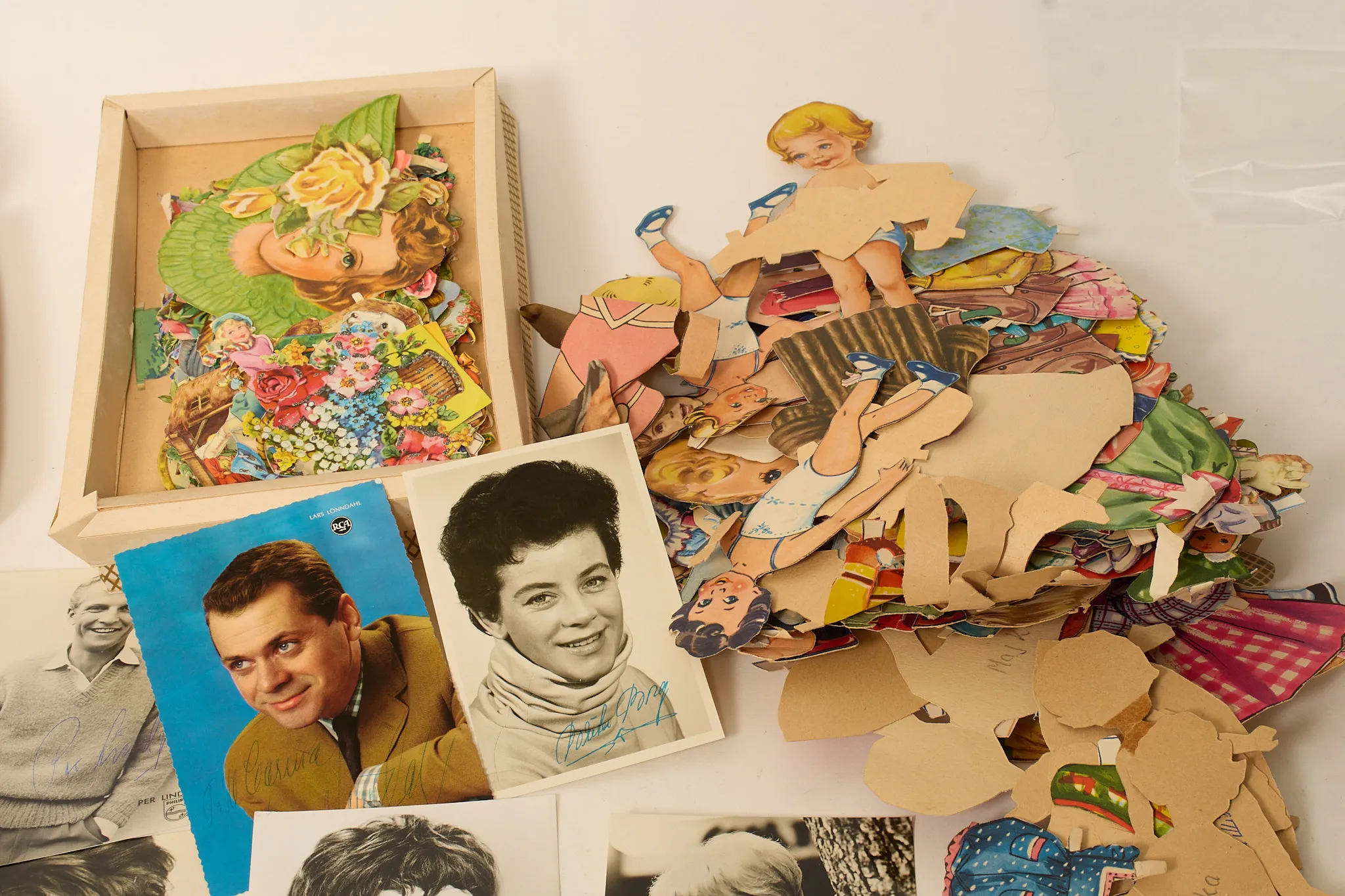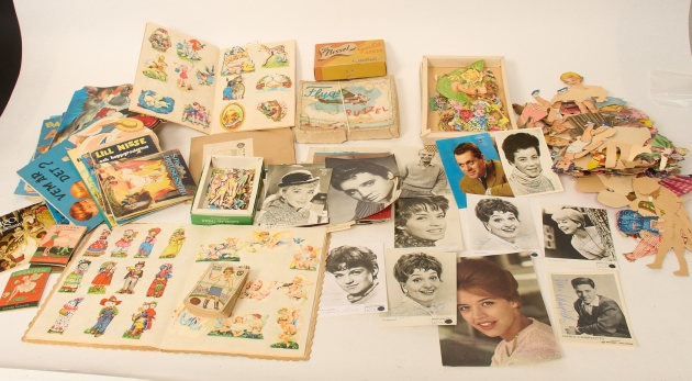 Klippdockor, äldre sagoböcker, idolbilder, en del med äkta autografer.