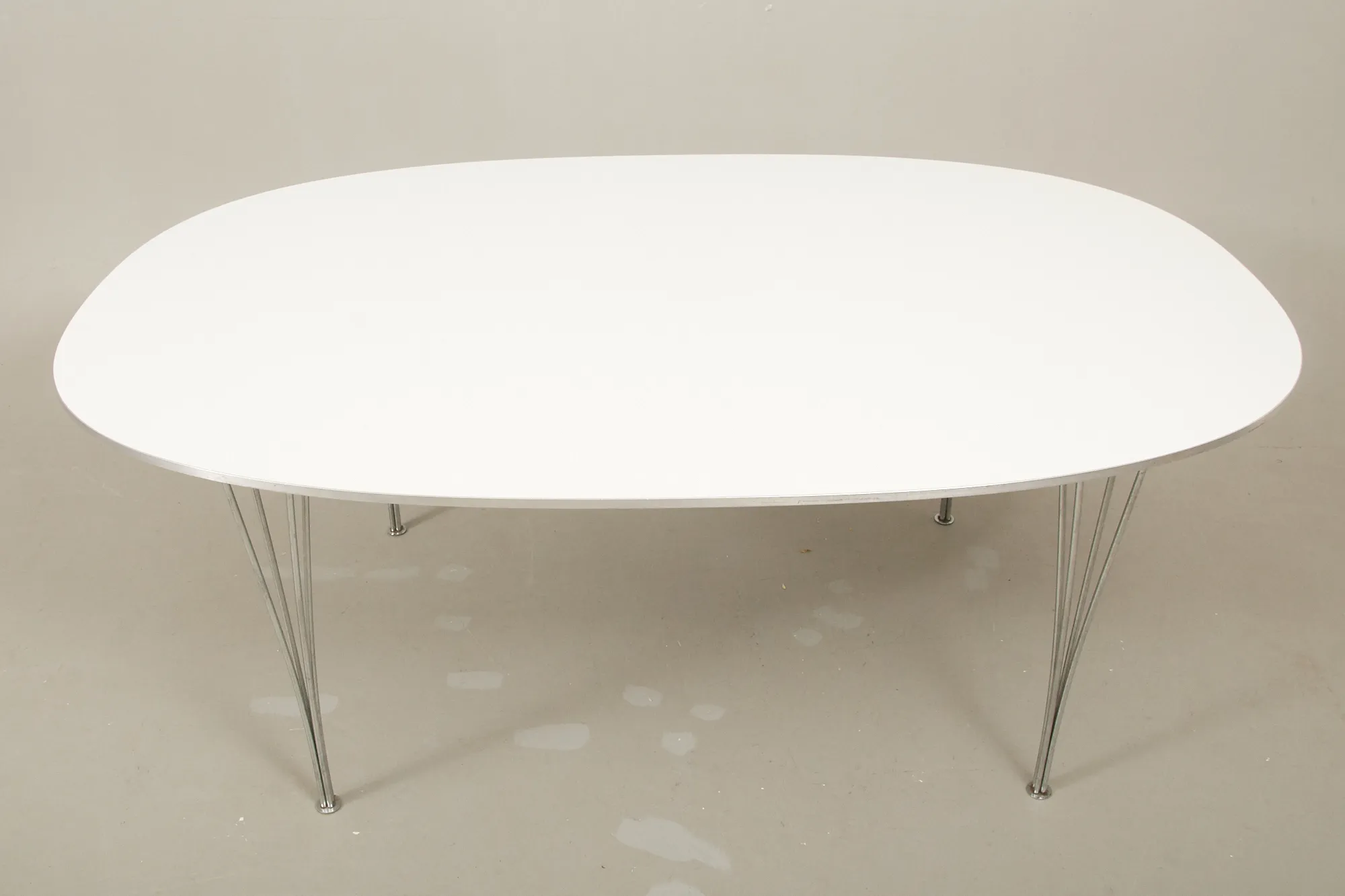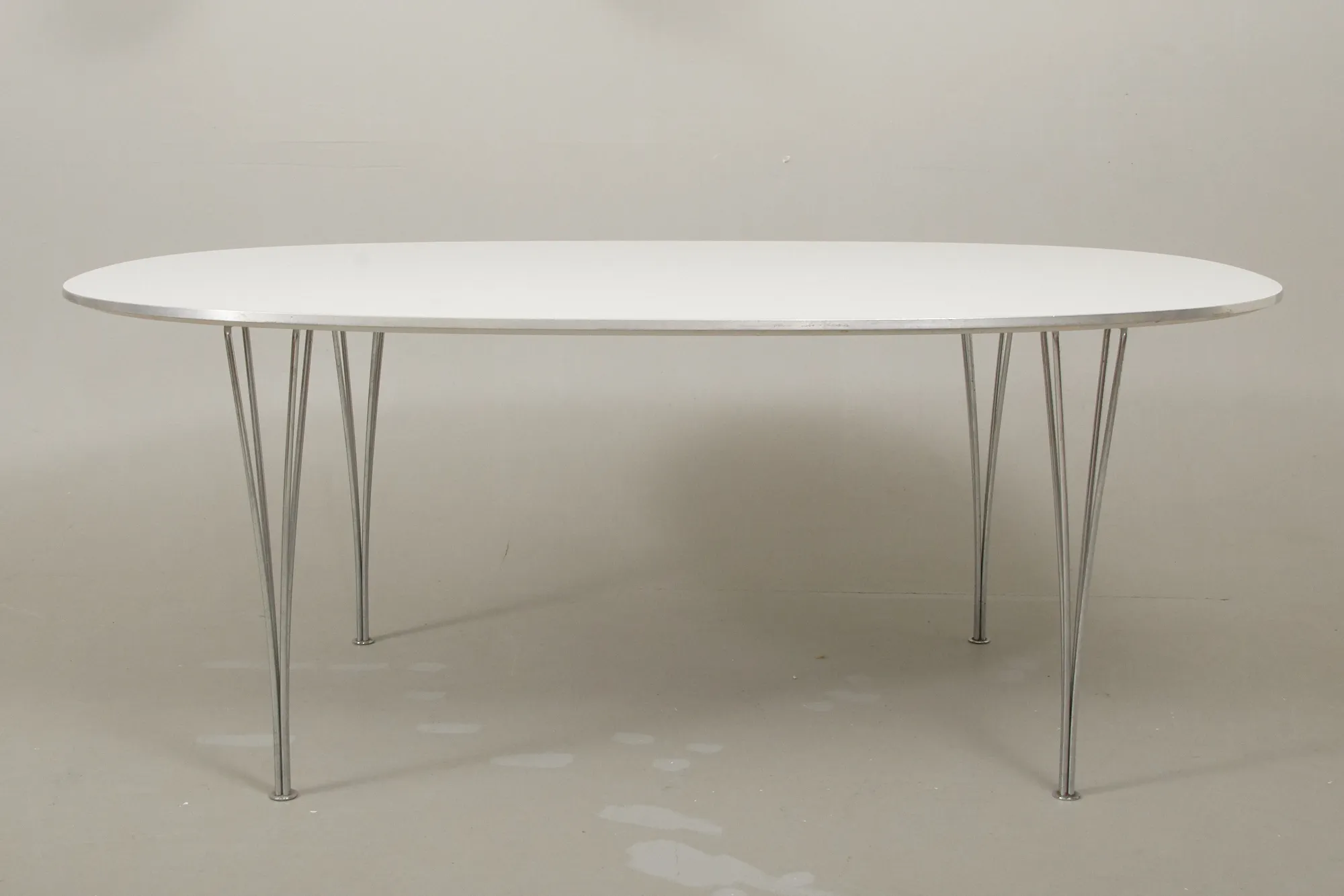 Bruno Mathsson och Piet Hein. Skiva av vit laminat med kant av stål samt 4 avtagbara ben. 180 x 120 cm, höjd 70 cm. Smärre bruksslitage.