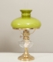 Mässingsfot med oljehus i glas, grön kupa, fint skick, funktionsduglig, höjd med brännarrör 48.5 cm.