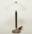 1900-talets första hälft, fot i mässing, samt trä, senare skärm, höjd 50 cm, bruksslitage, ojordad elkontakt.