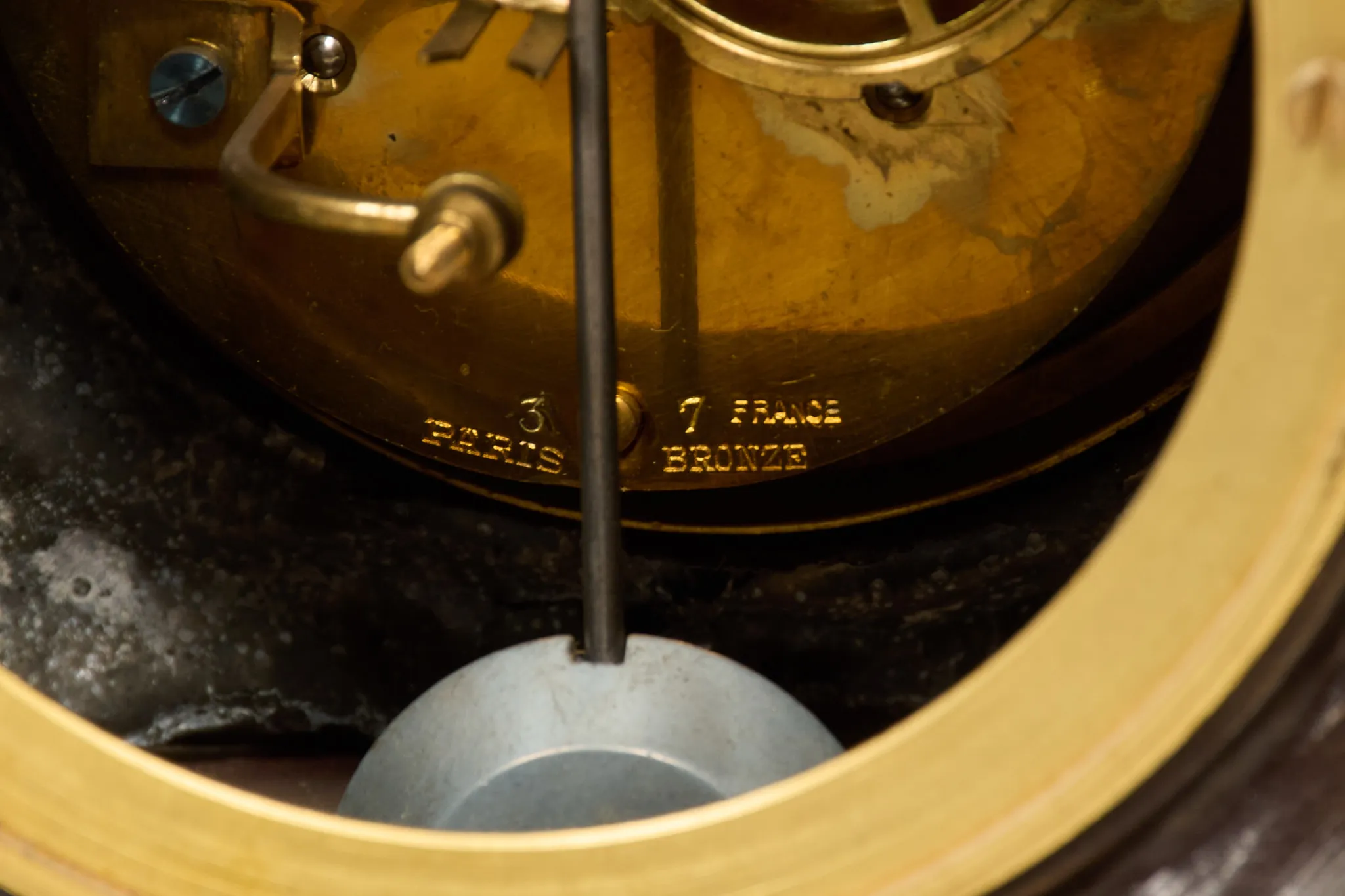 Par Louis et Francois Moreau. Signerad, patinerad metall, marmorsockel. Bredd 38 cm, höjd ca 31 cm. Ej funktionstestad, små nagg undertill i sockel.