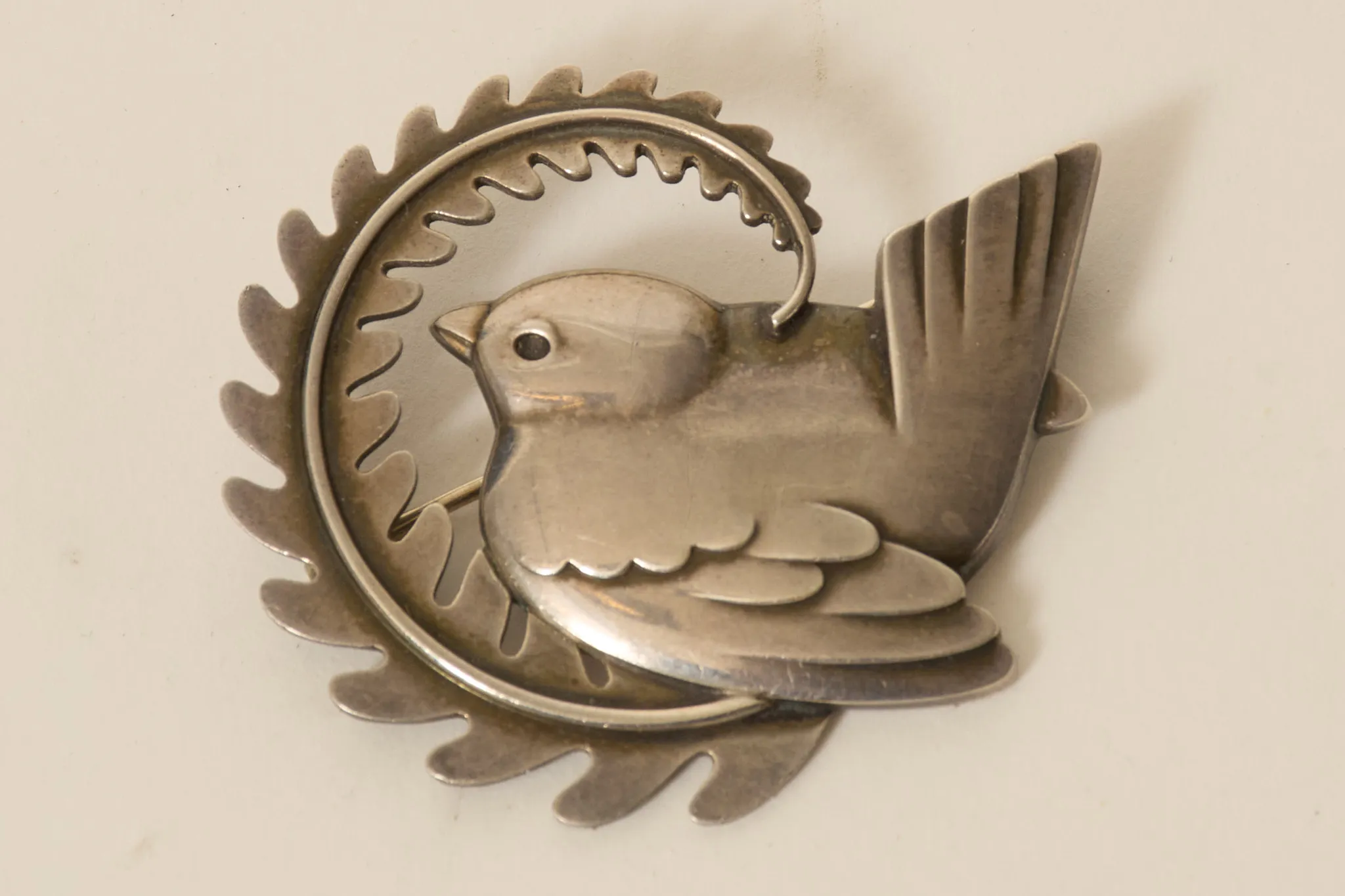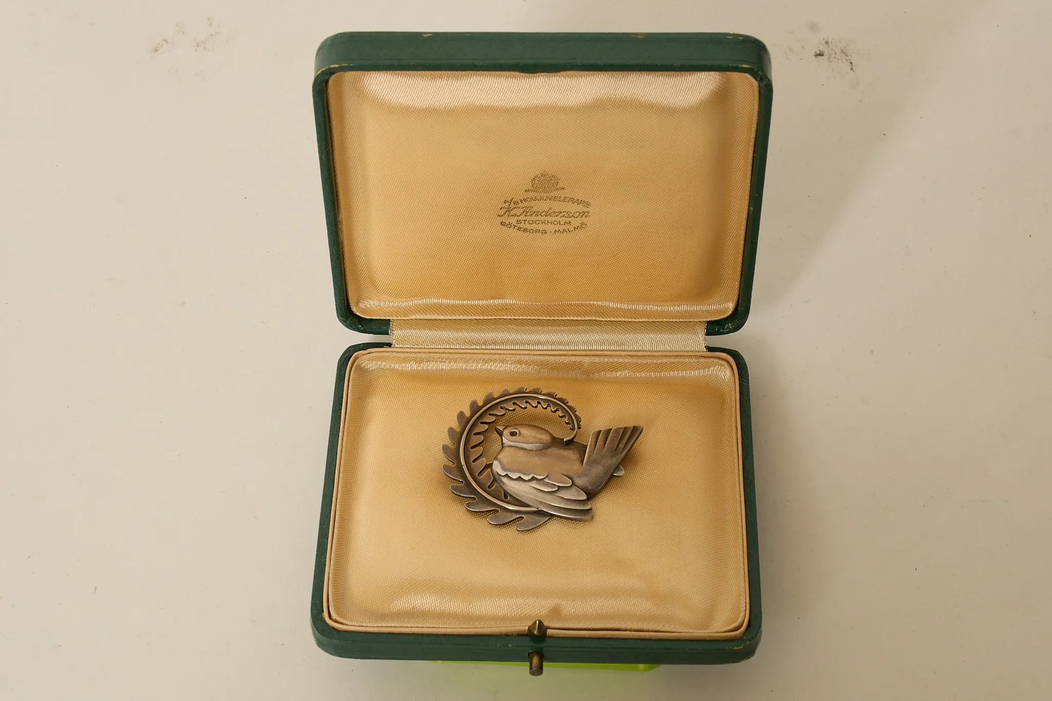 Design Arno Malinowski, 1930-tal, i form av fågel med ormbunkskvist, 4,5 x 4,5 cm, smärre bruksslitage.