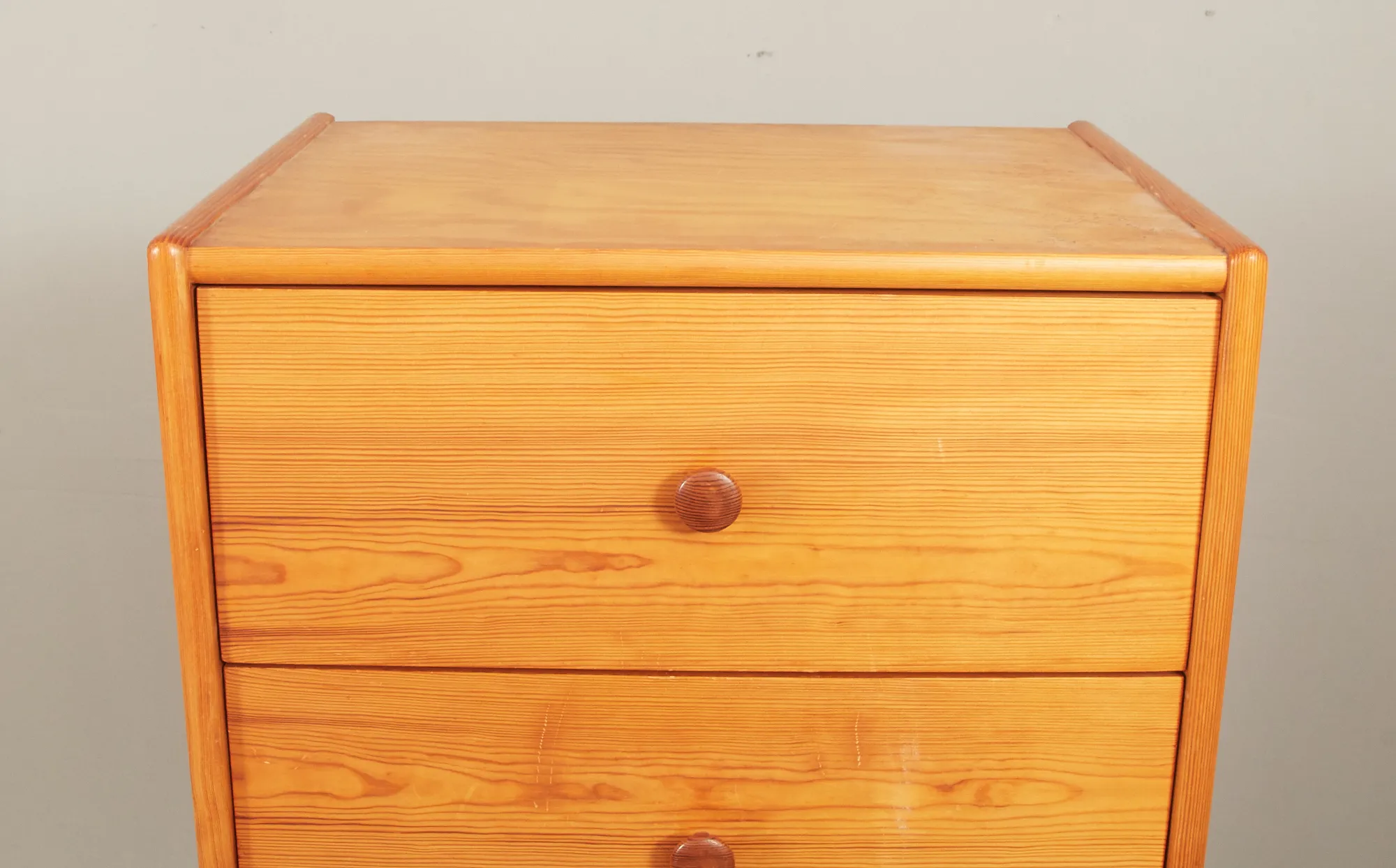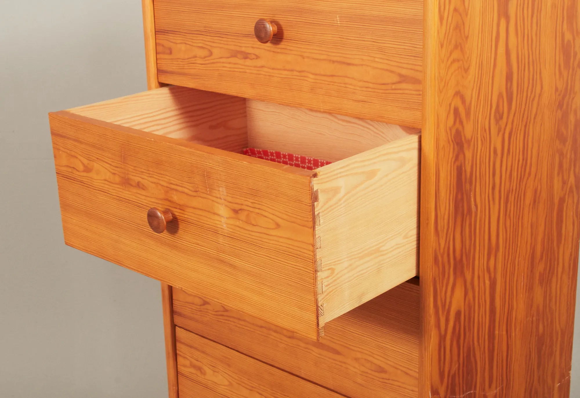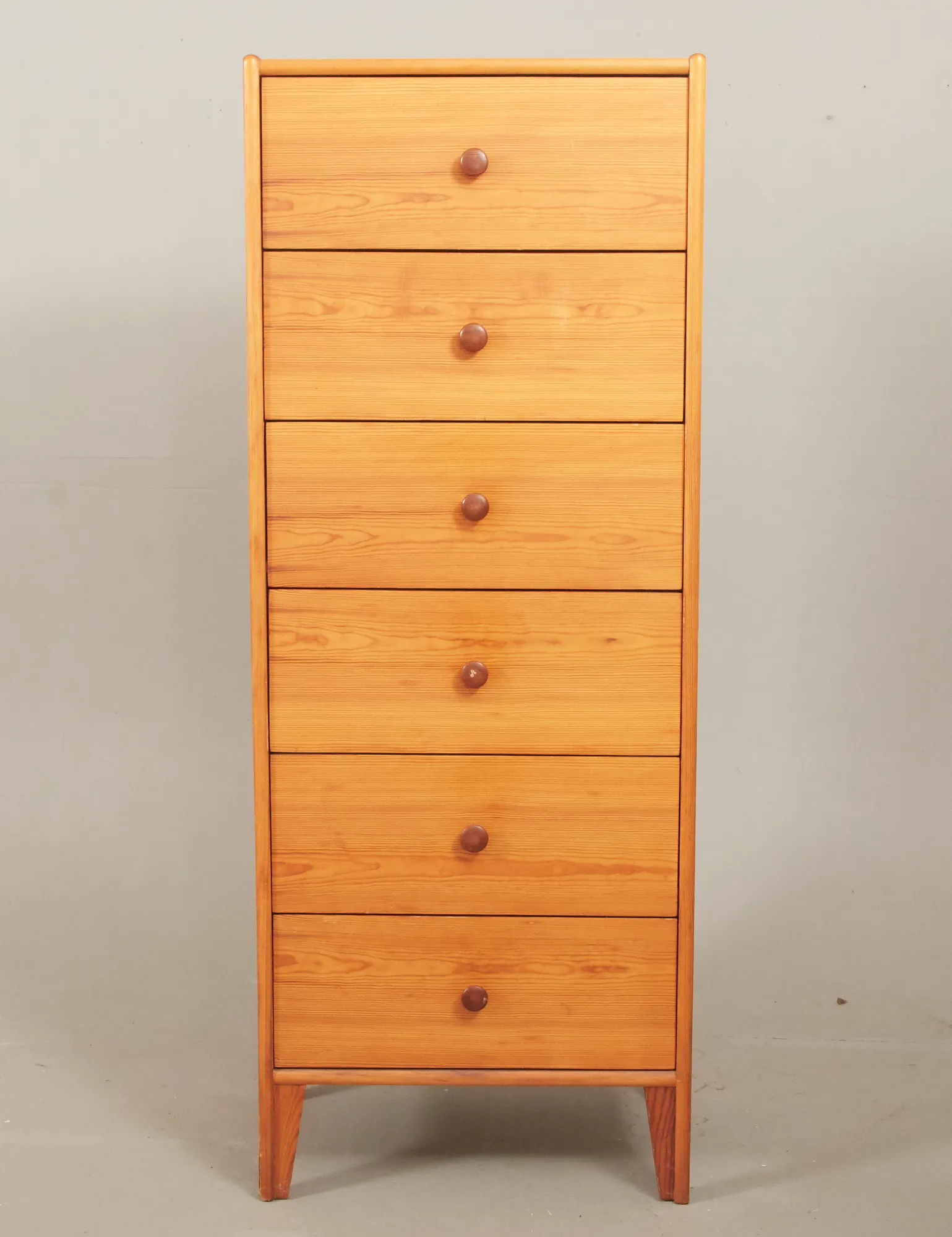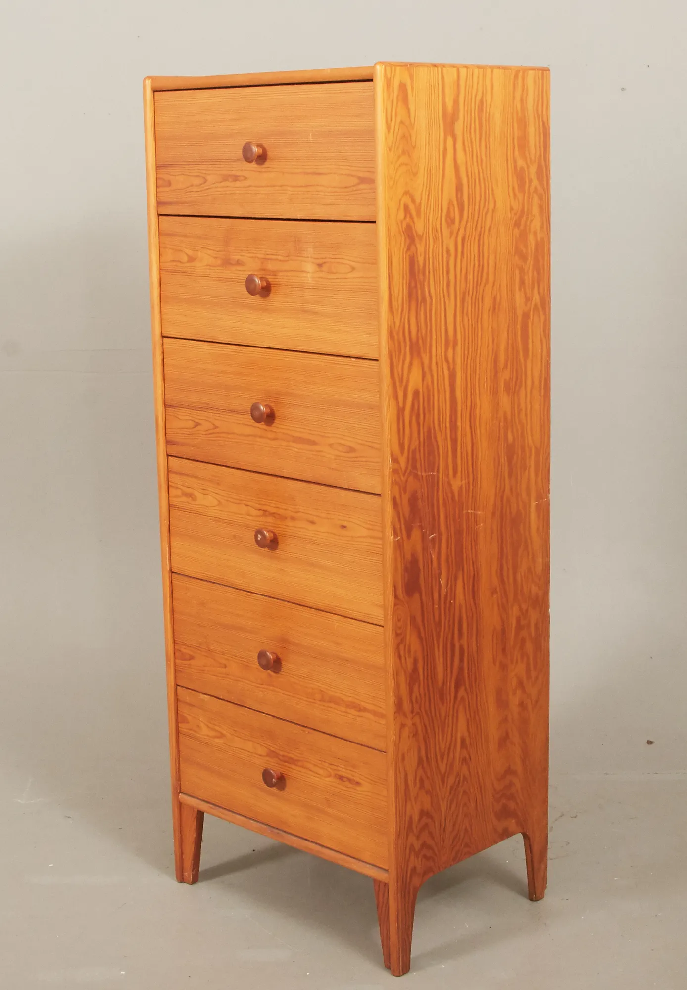 Furu, 56 x 41 cm, höjd 147 cm. 6 lådor. Bruksslitage. Färgskav