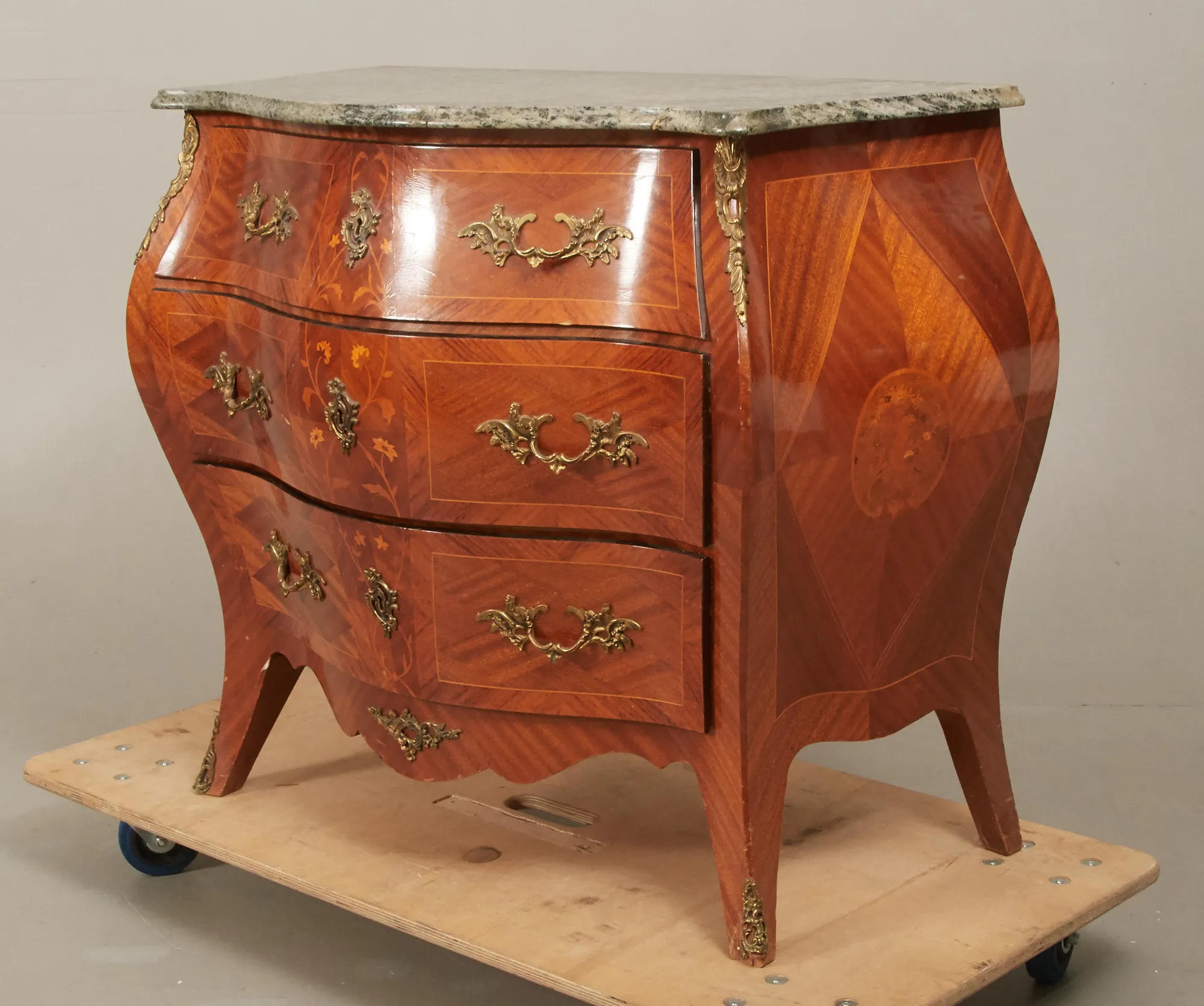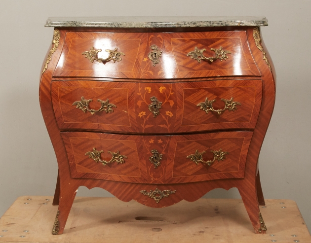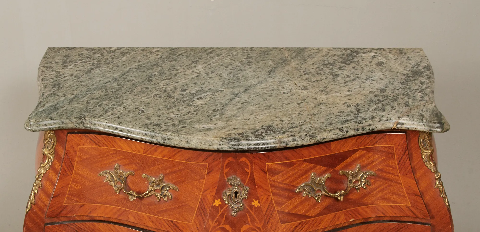 3 utdragslådor, skiva i sten. 88 x 48 cm, höjd ca 79 cm. Bruksslitage, lagning i skivan.