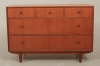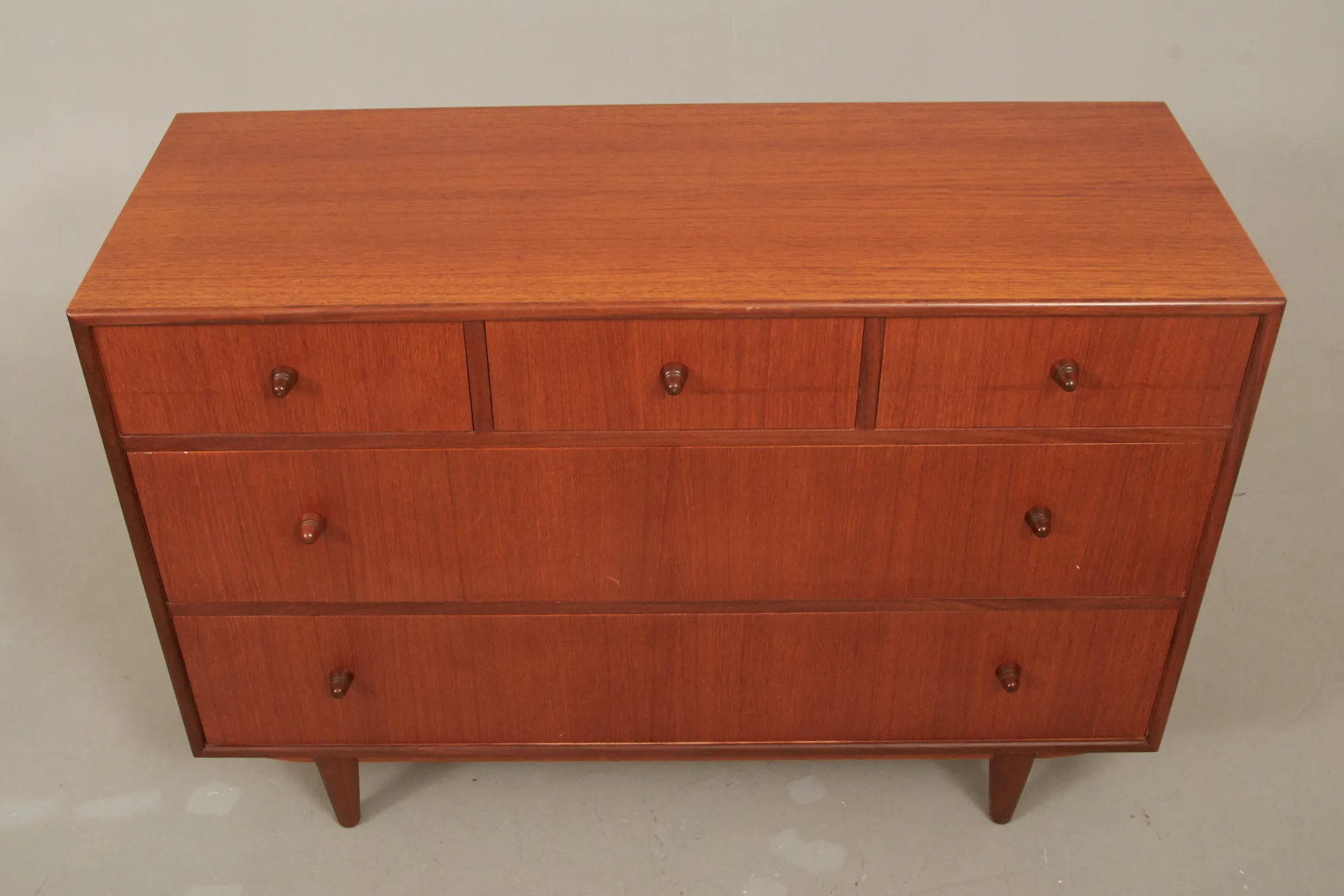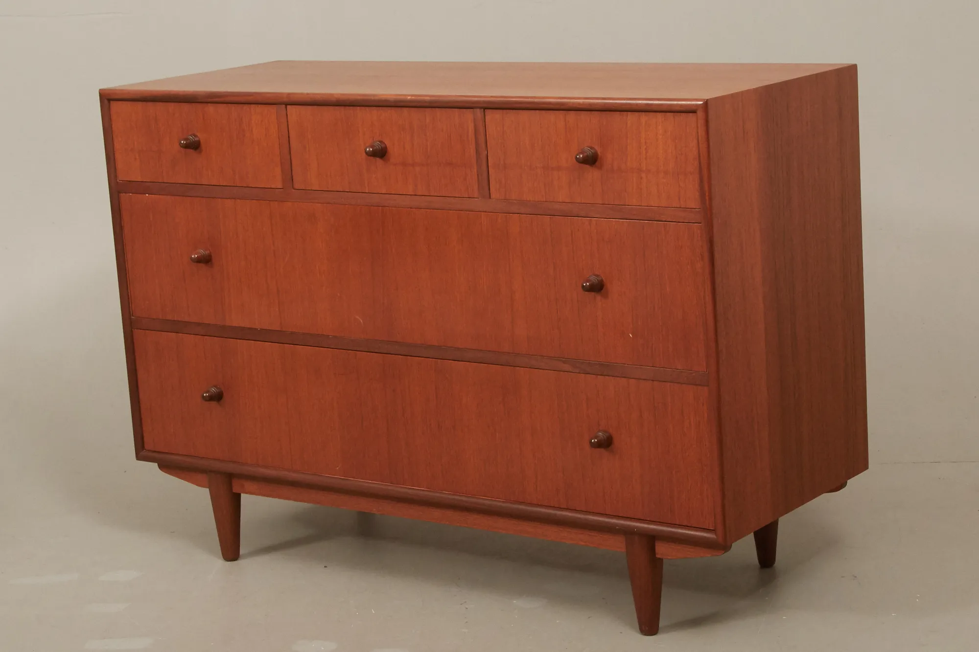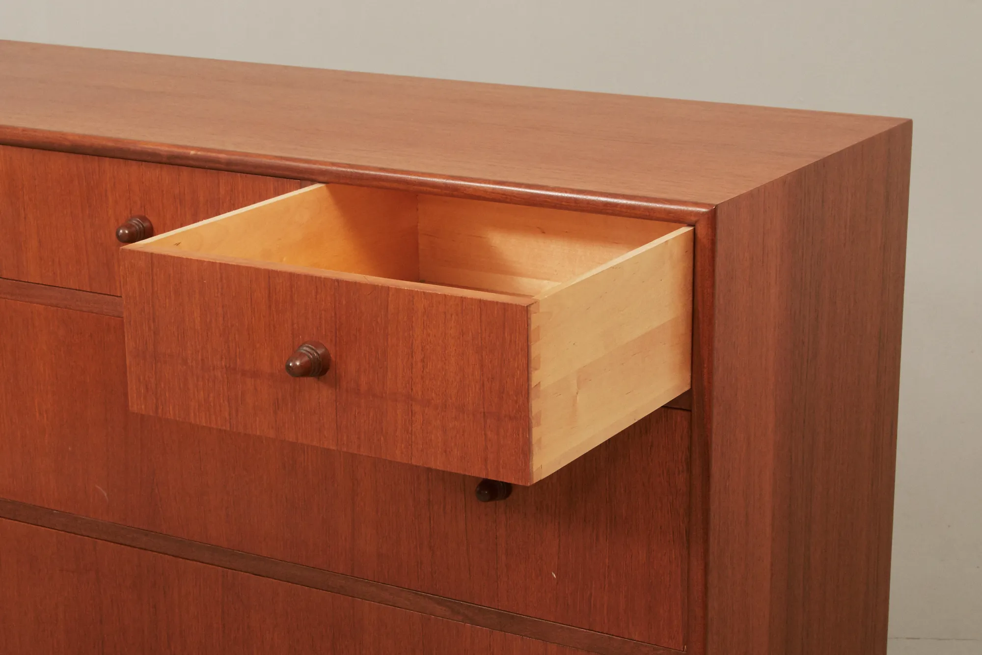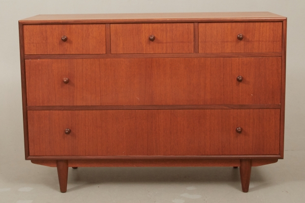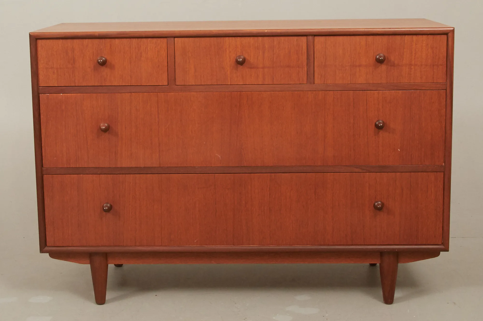 Teak, 5 utdragslådor, 110 x 42 cm, höjd 76 cm, smärre bruksslitage.