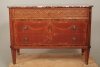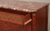 Intarsiadekor, profilerad stenskiva samt mässingsbeslag, 110 x 47 x 81 cm.