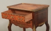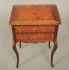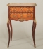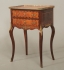 Fanerad byrå med intarsiadekor. Två lådor. Gallerkant och beslag i mässing. 49x35 cm, höjd72 cm. Nyckel finns. Slitage.