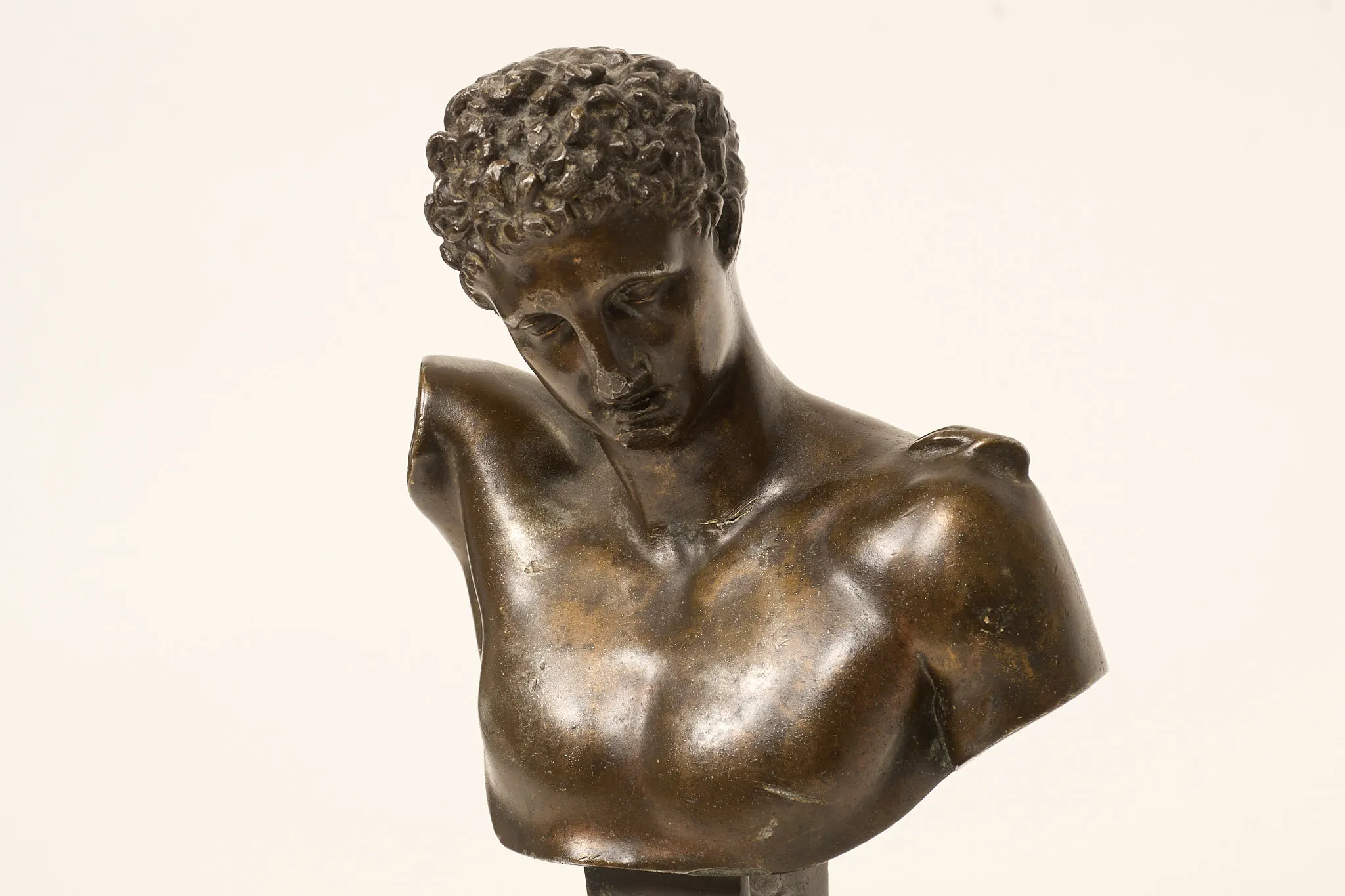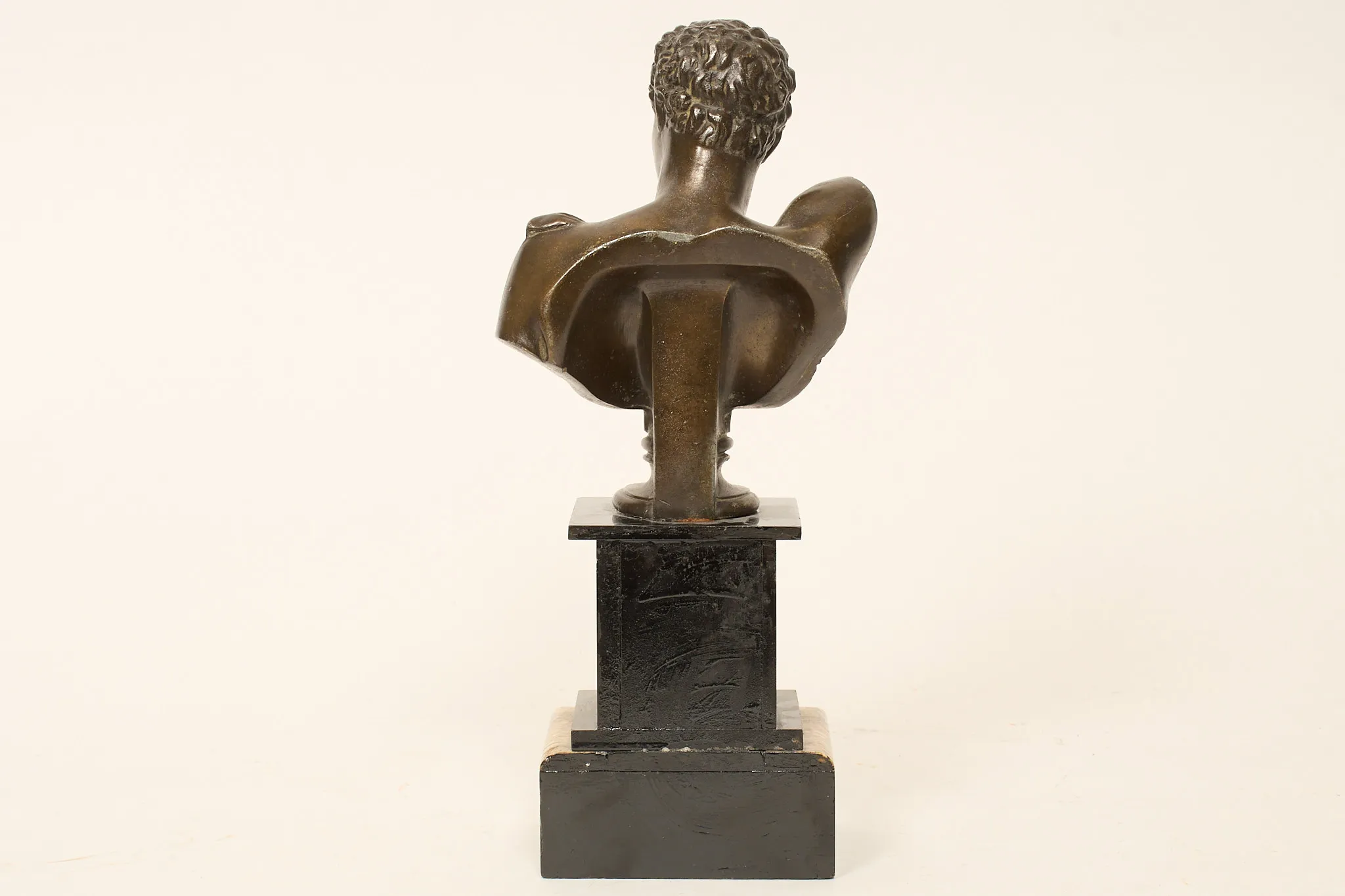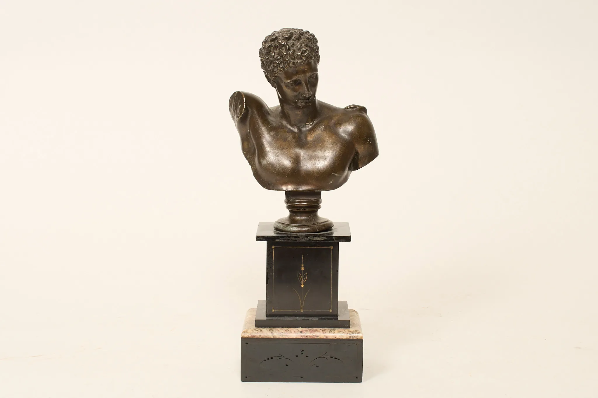 Föreställande den grekiska guden Hermes. Brons på sten/trä sockel. Höjd ca 35 cm inkl sockel. Bruksslitage, skav, nagg