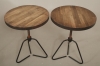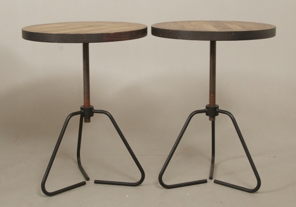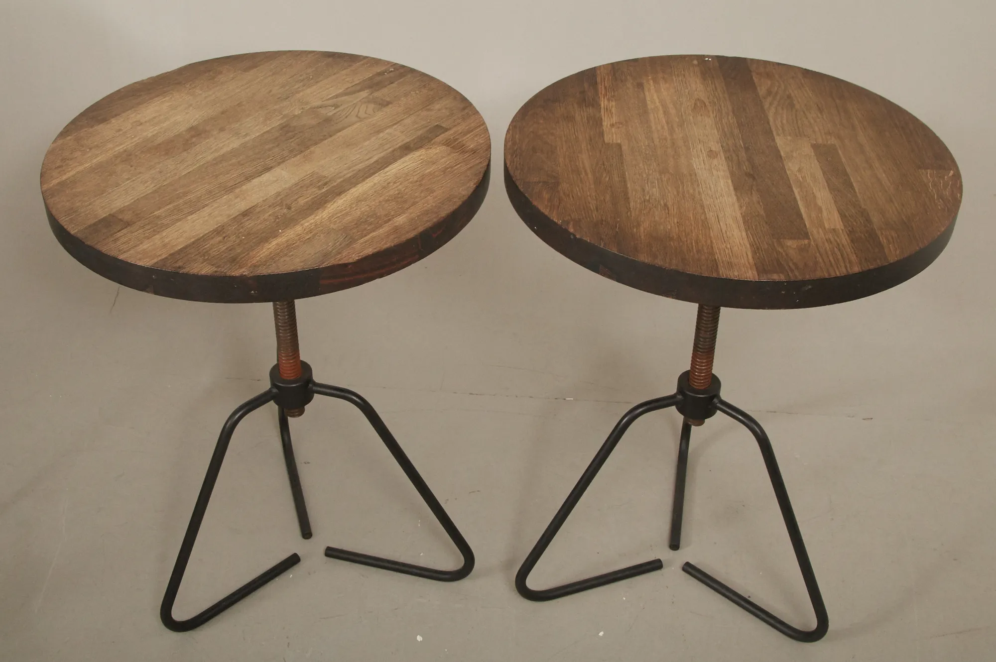 2 st, skiva i betsad ek, underrede i järn, diam 55 cm, höjd ca 75 cm (men höjden är ställbar), bruksslitage.