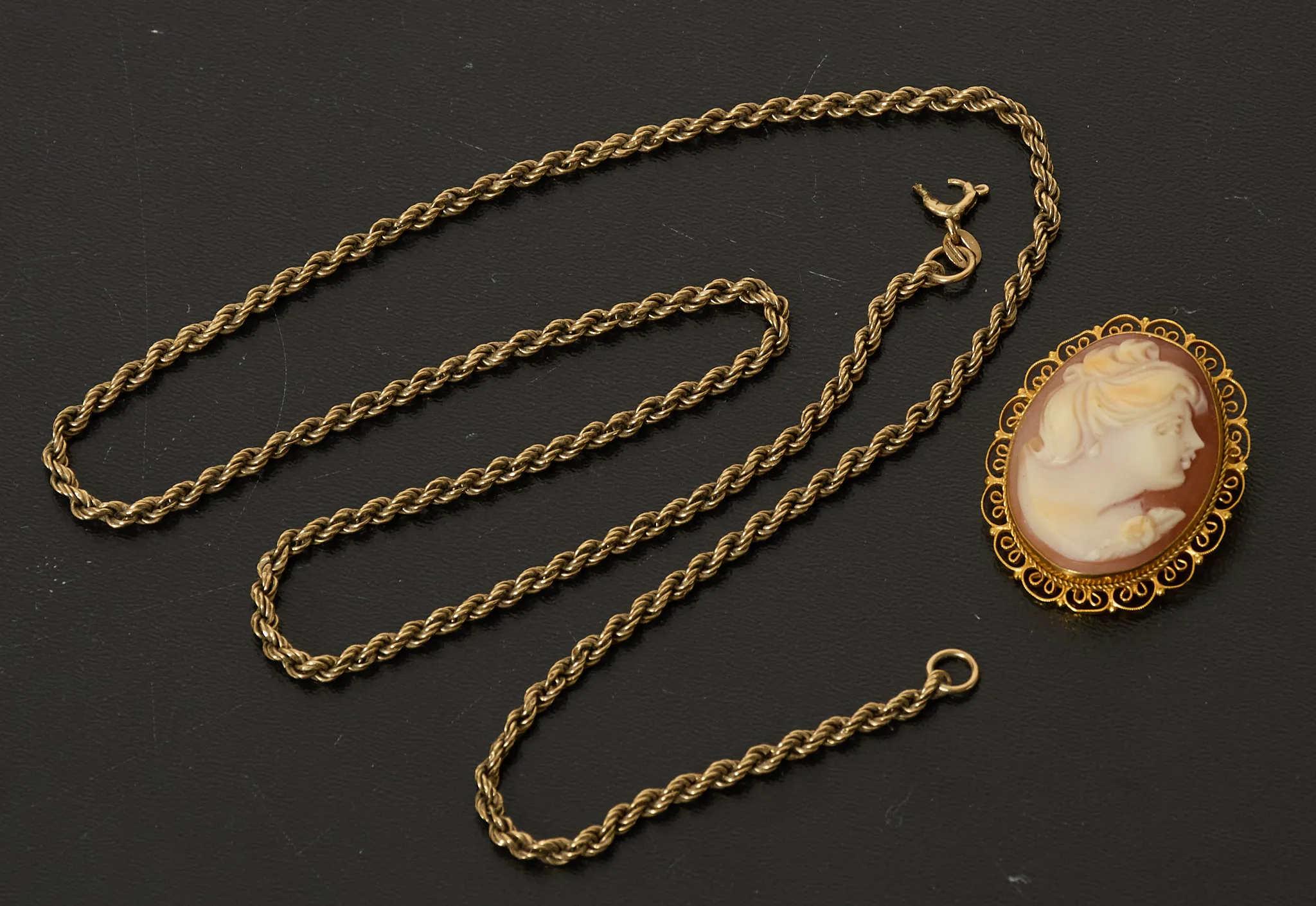 380. Camebrosch, samt kedja 9-k guld