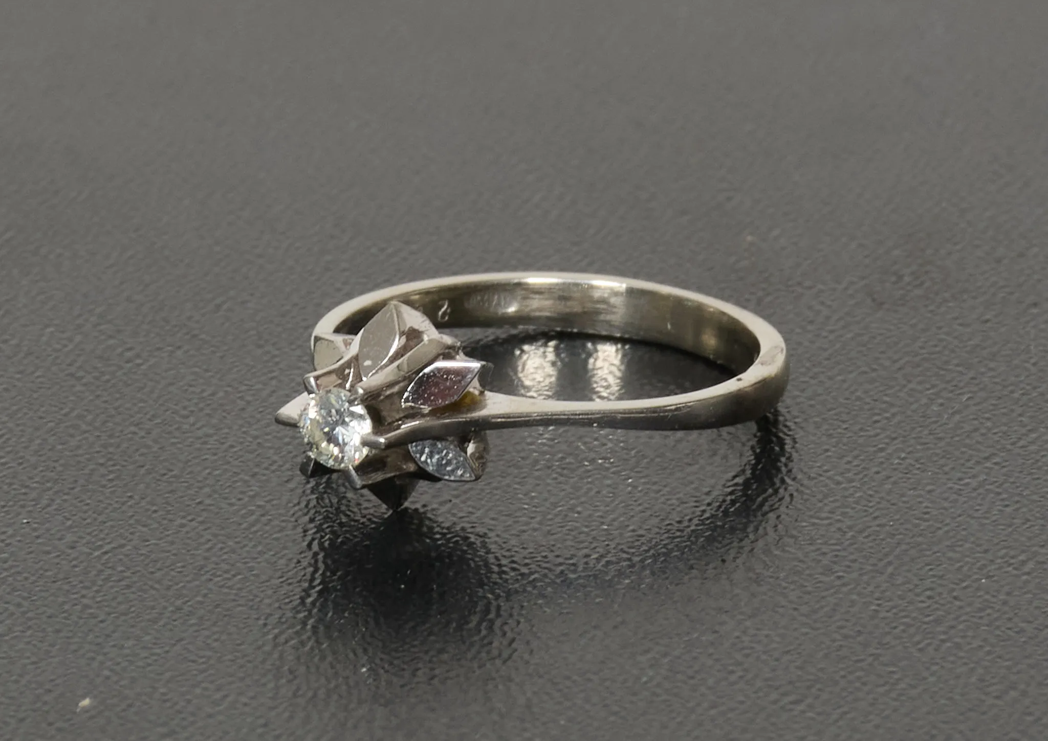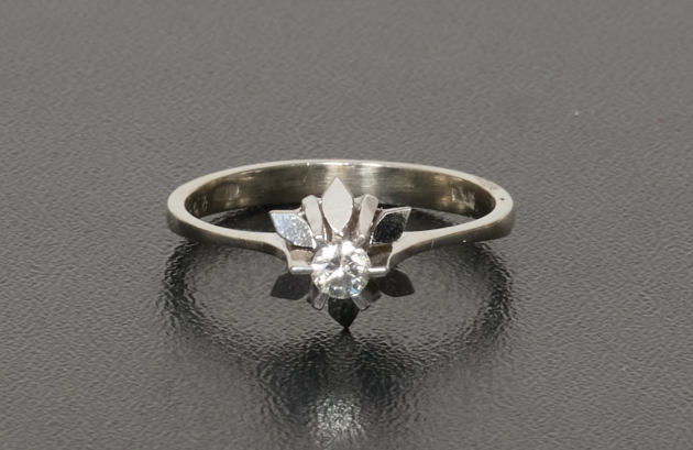 Med en mindre diamant på ca 0,1 karat, strl. 16, tot. vikt 2,3 gram, gott skick