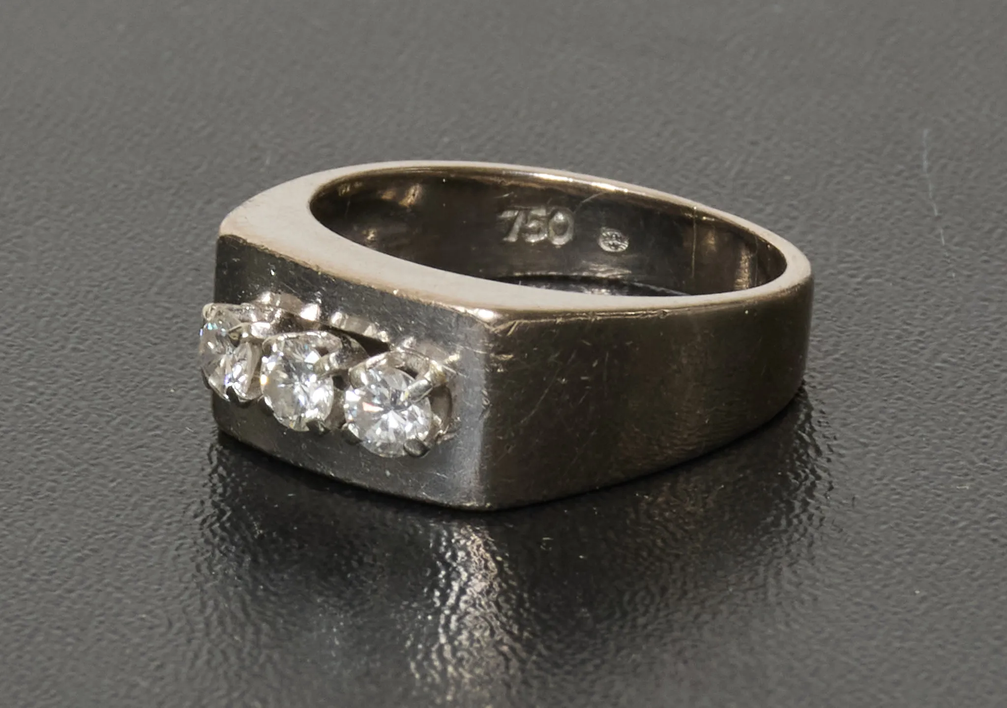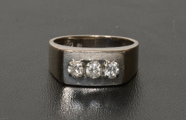 Med 3 st diamanter på 0,1 karat, strl, 17, tot. vikt 7,4 gram, smärre slitage