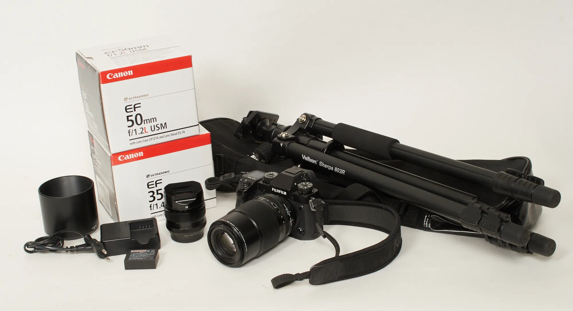 Med 2 st objektiv, samt stativ, smärre yttre bruksslitage, fungerar. Kartonger tomma, ej Canonobjektiv.