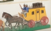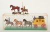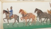 Bemålat trä, i plexiglasmonter, 2 lösa hästar medföljer. Läng monter 47 cm.