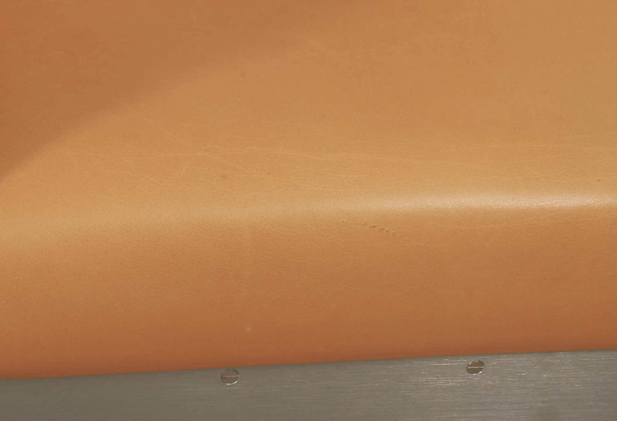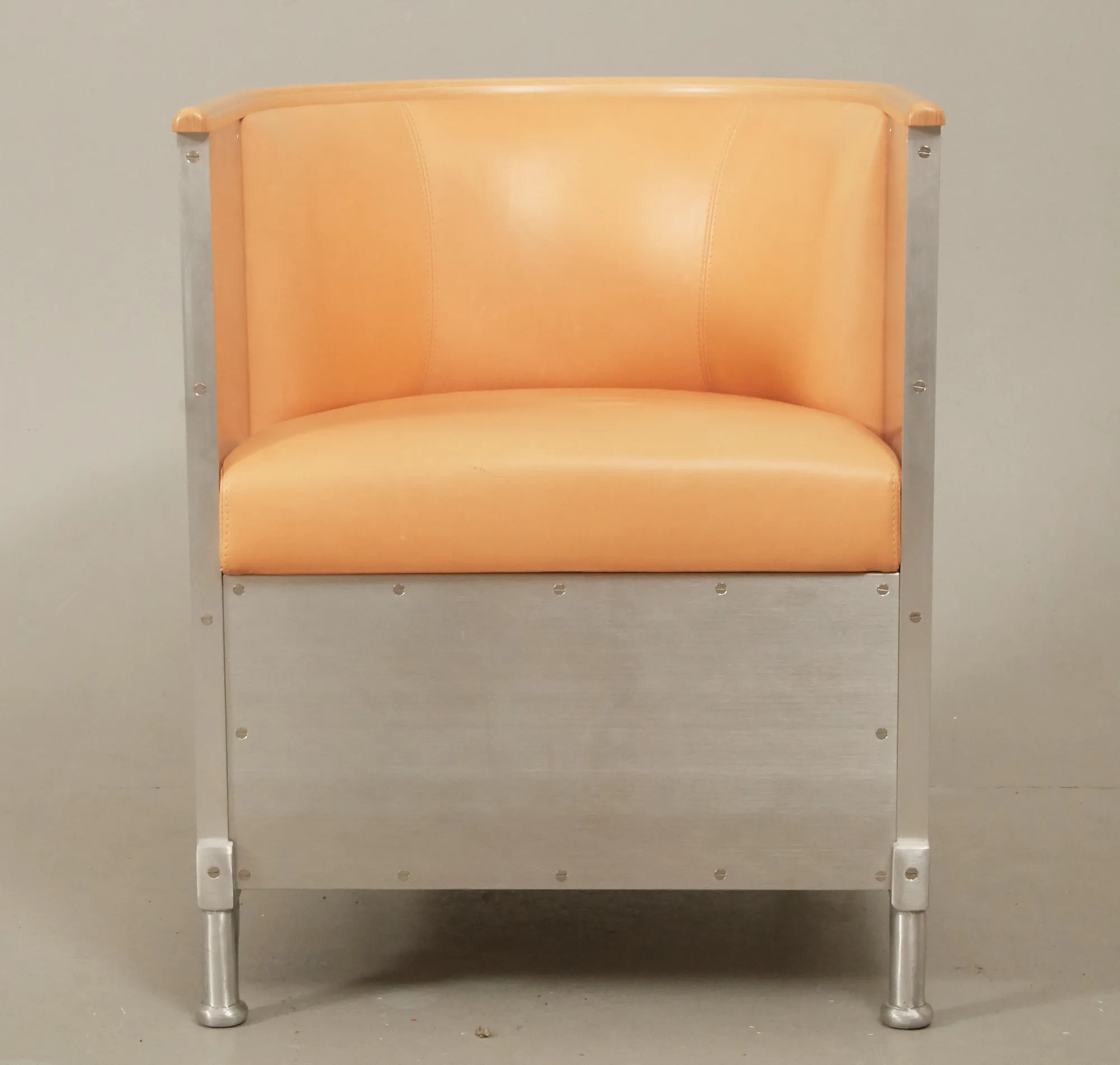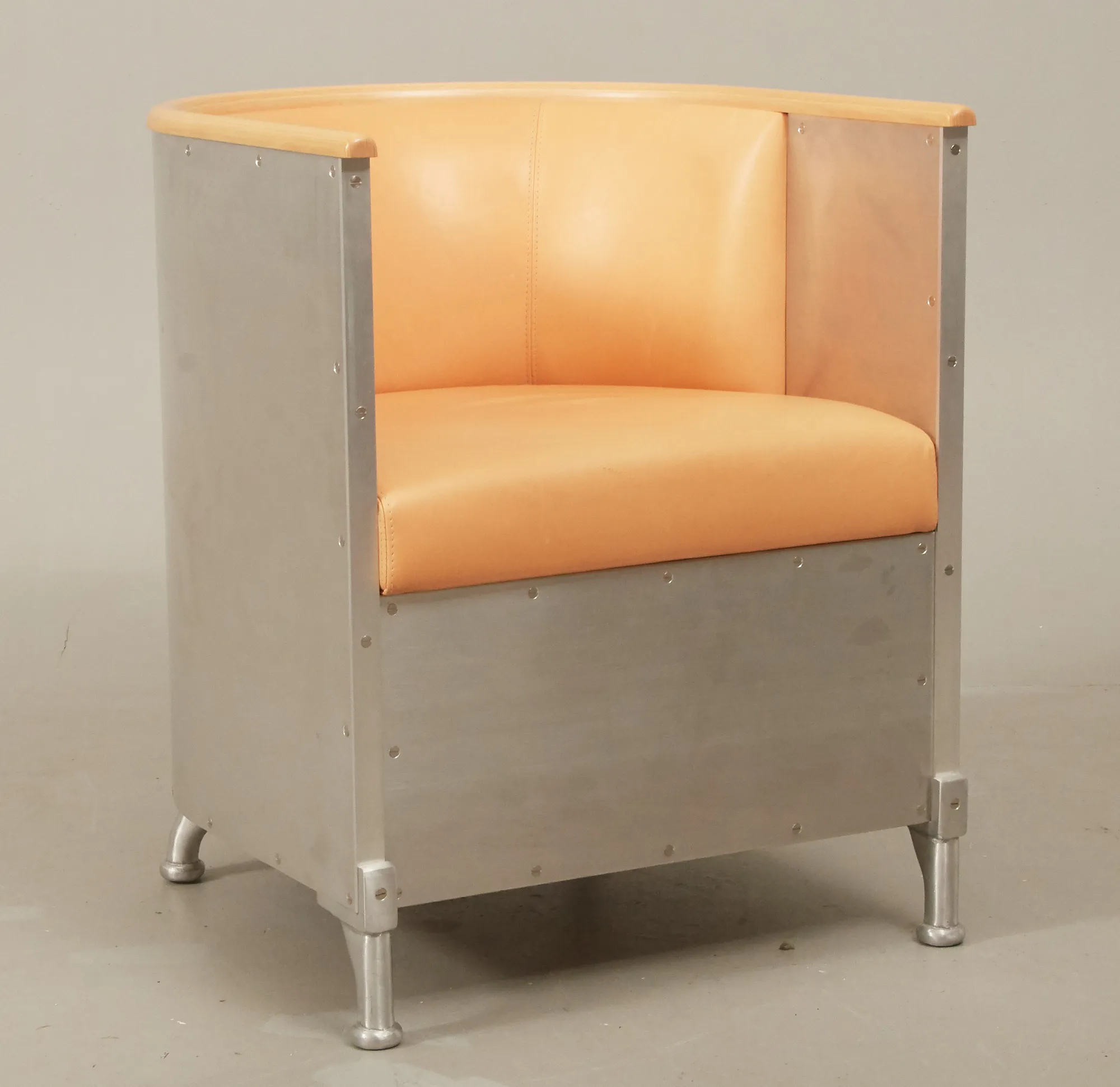 Klädd med mattborstad aluminium, sits i naturfärgat läder, list i bok. Gott skick, men några mindre repor i läder.