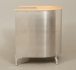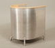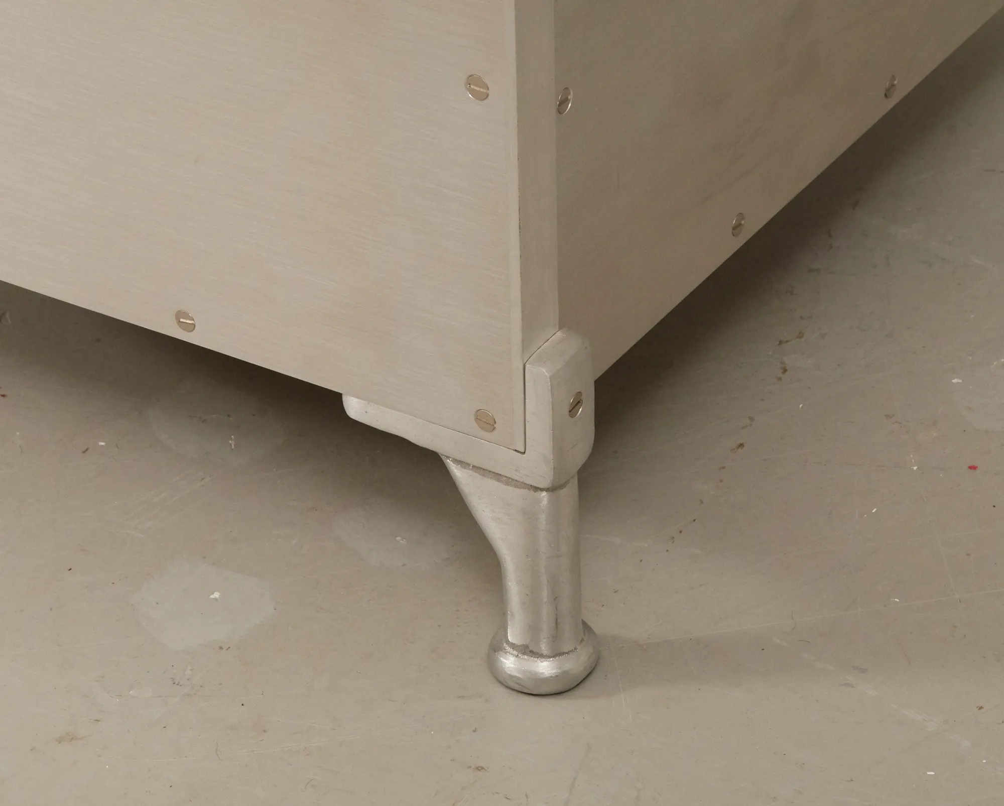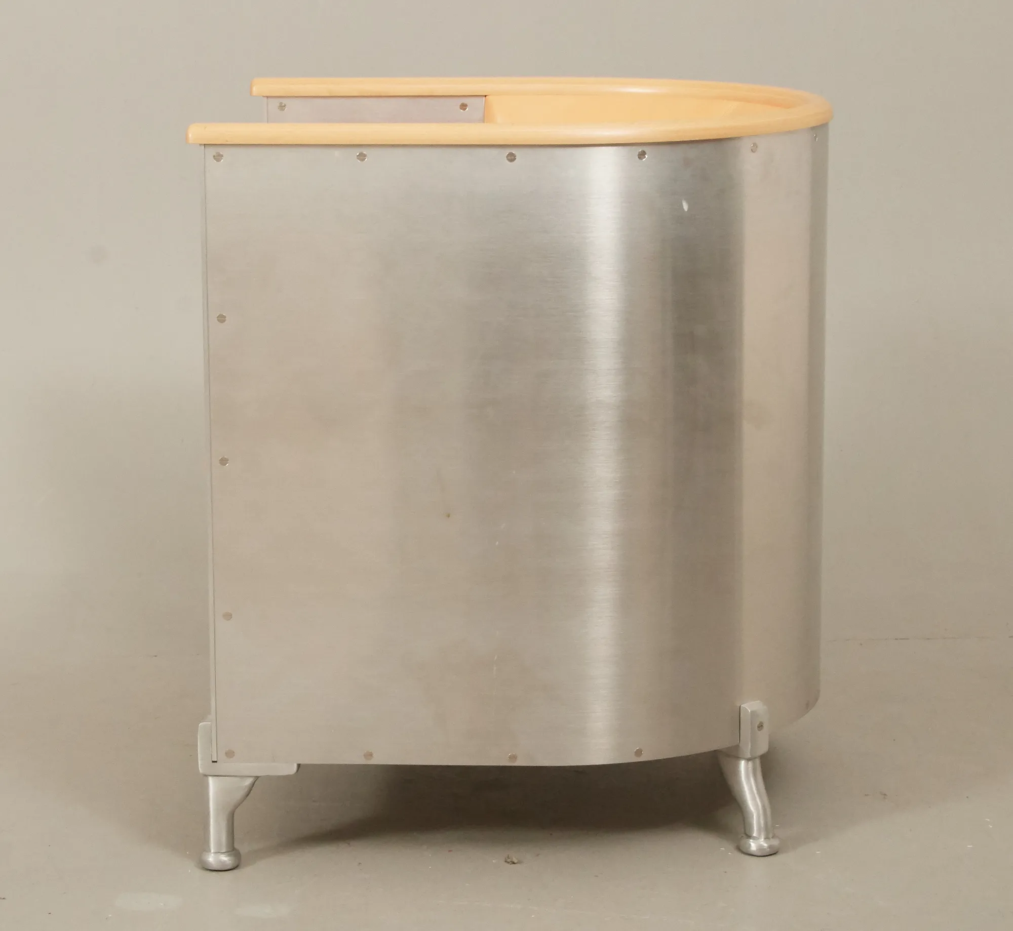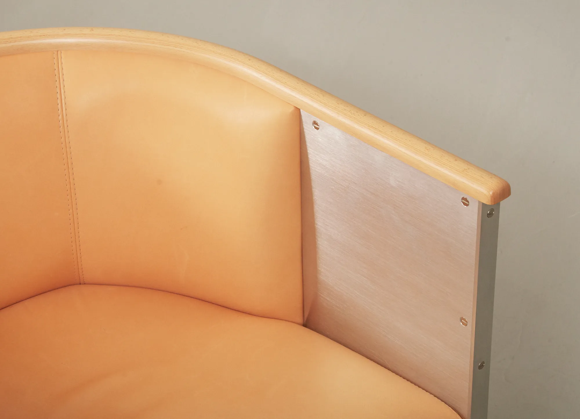 Klädd med mattborstad aluminium, sits i naturfärgat läder, list i bok. Gott skick, men några mindre repor i läder.