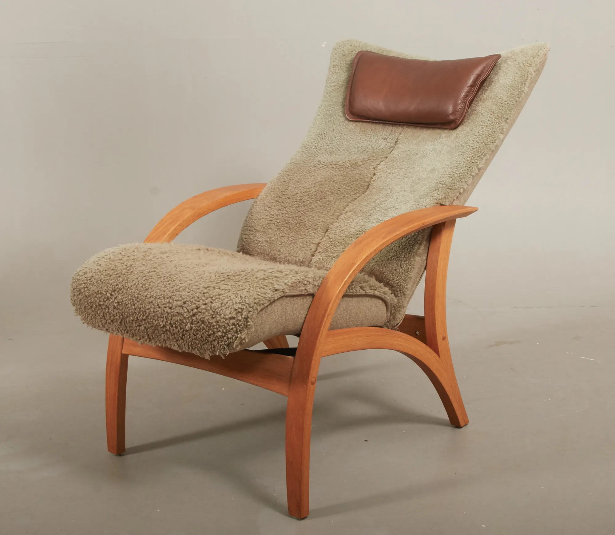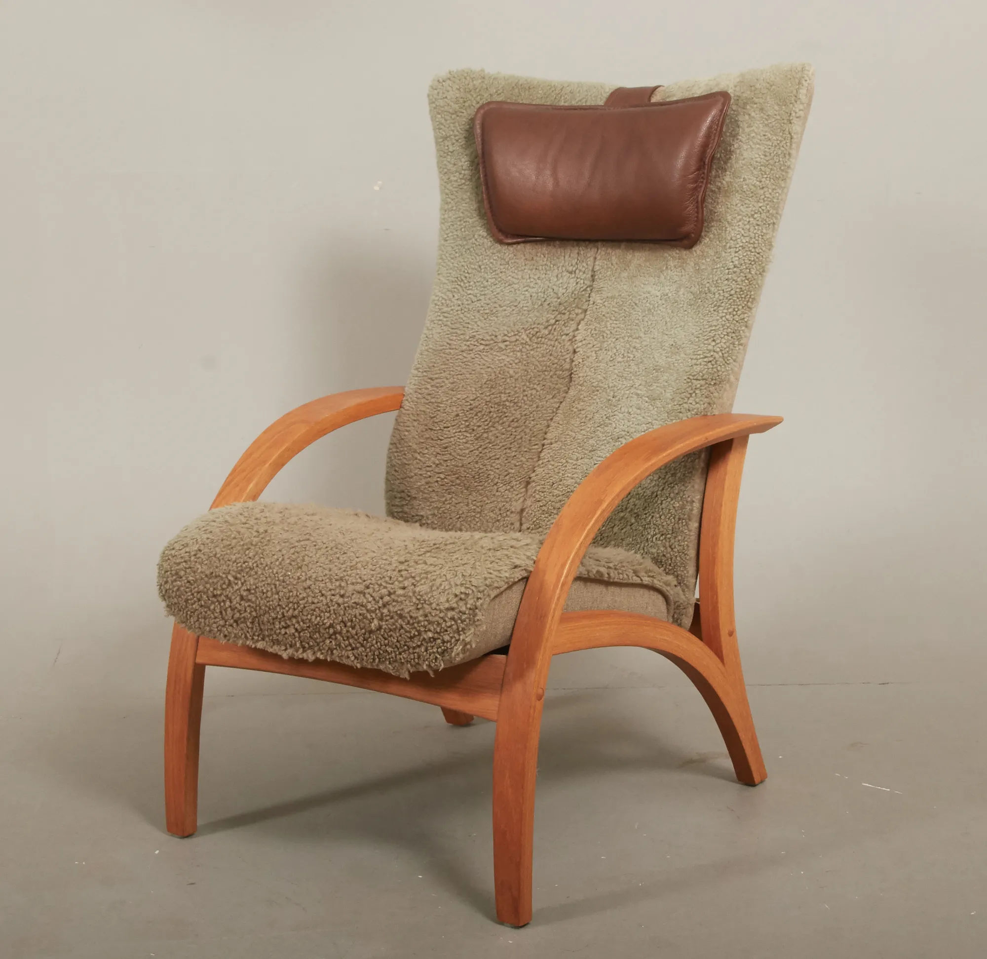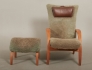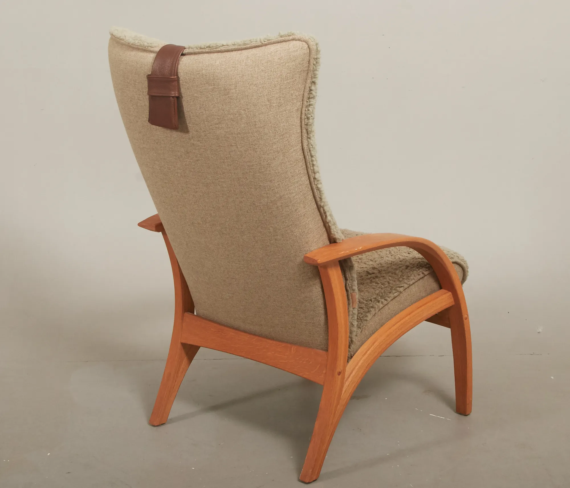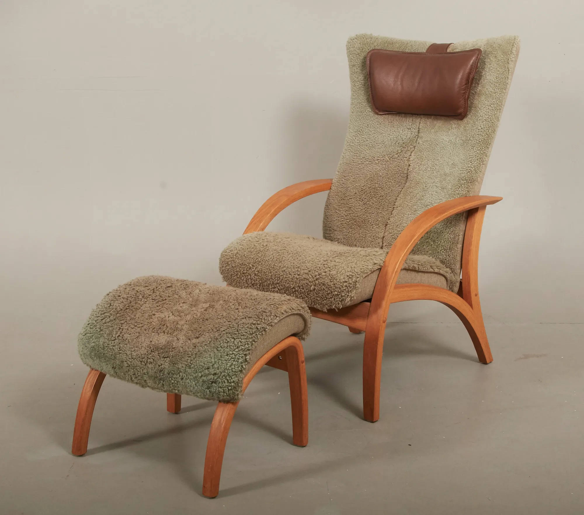 Med pall, stomme i ek, klädsel i fårskinn, smärre slitage, men fårskinn solblekt/smutsigt.
