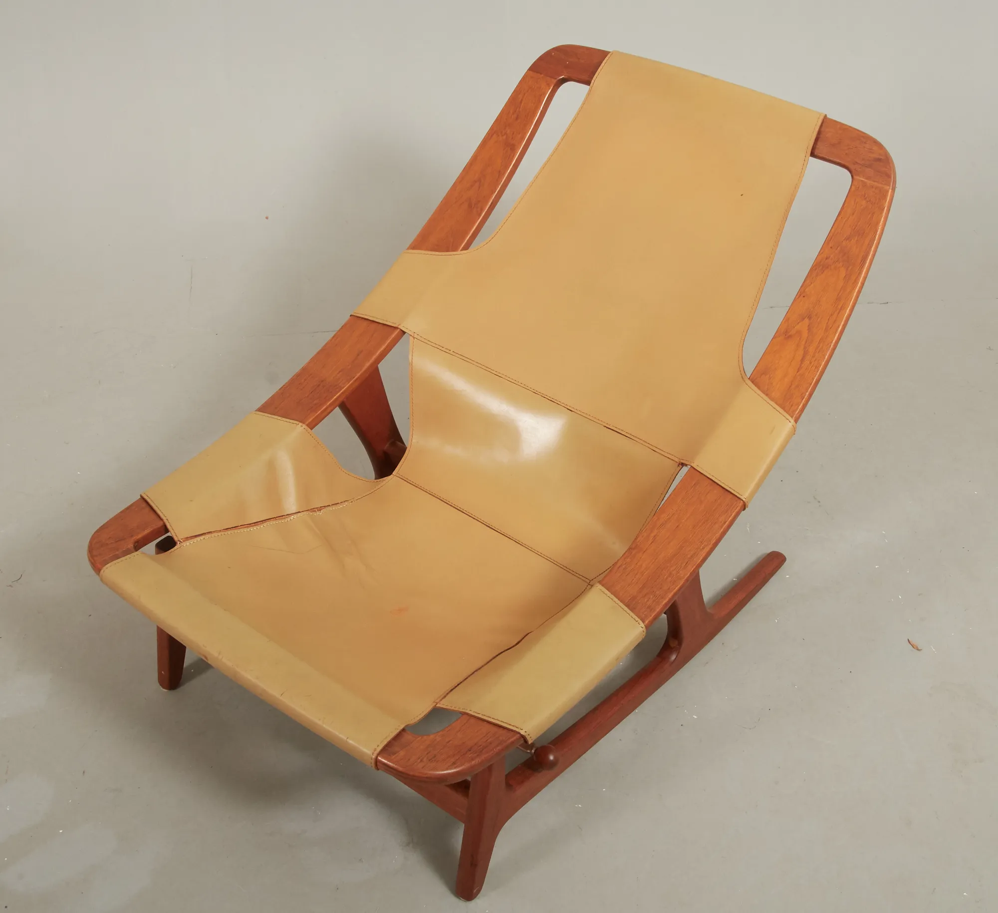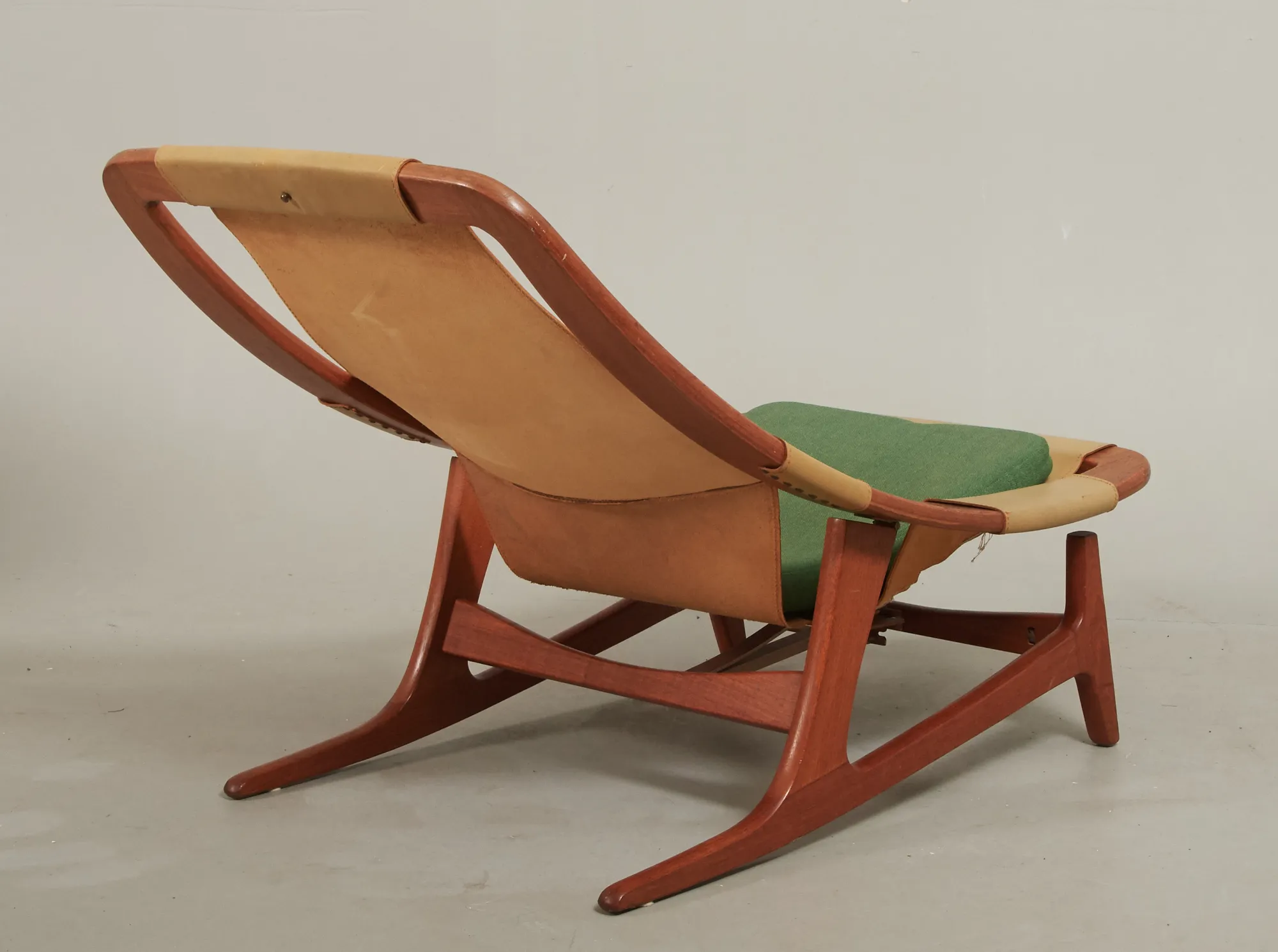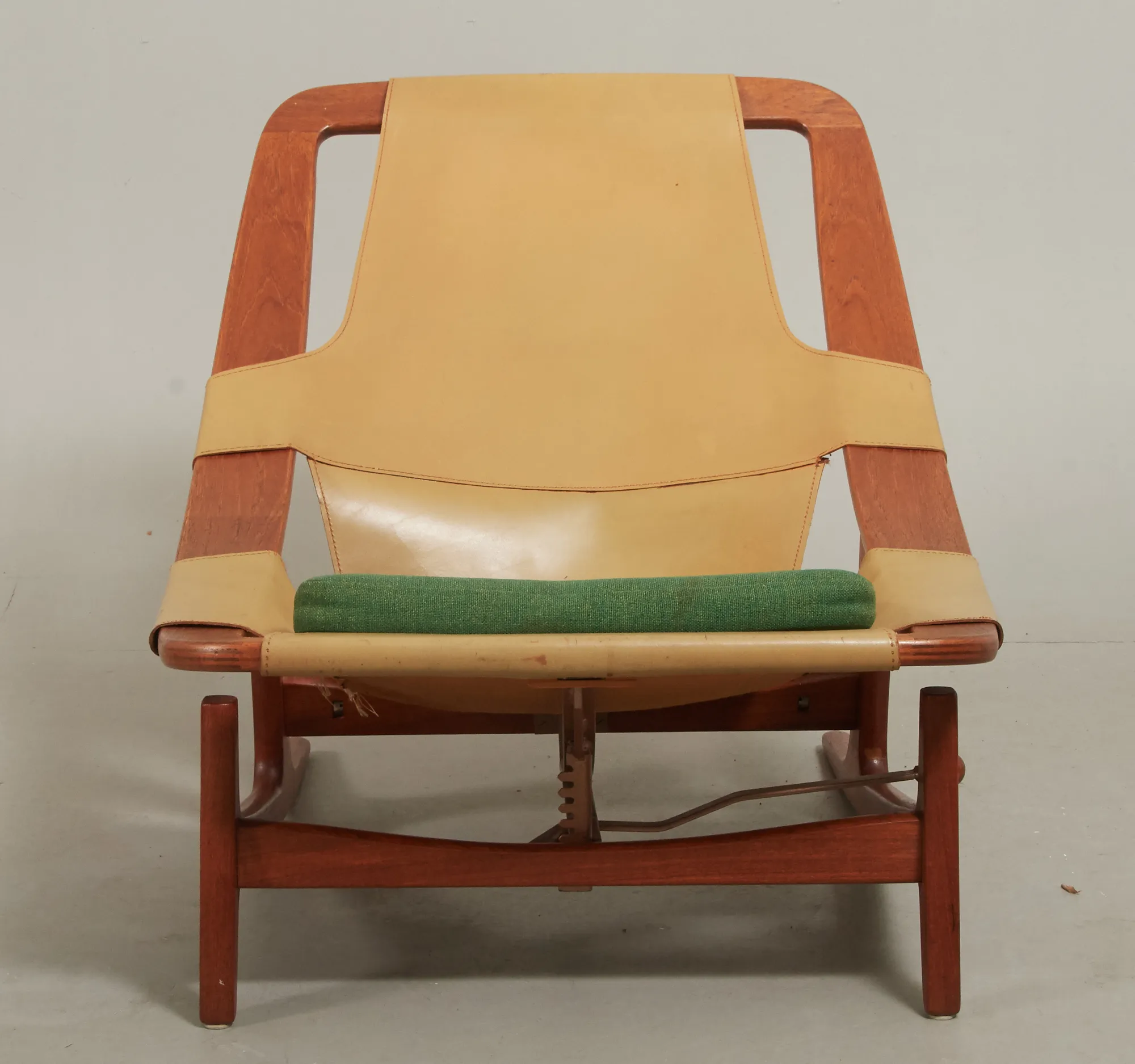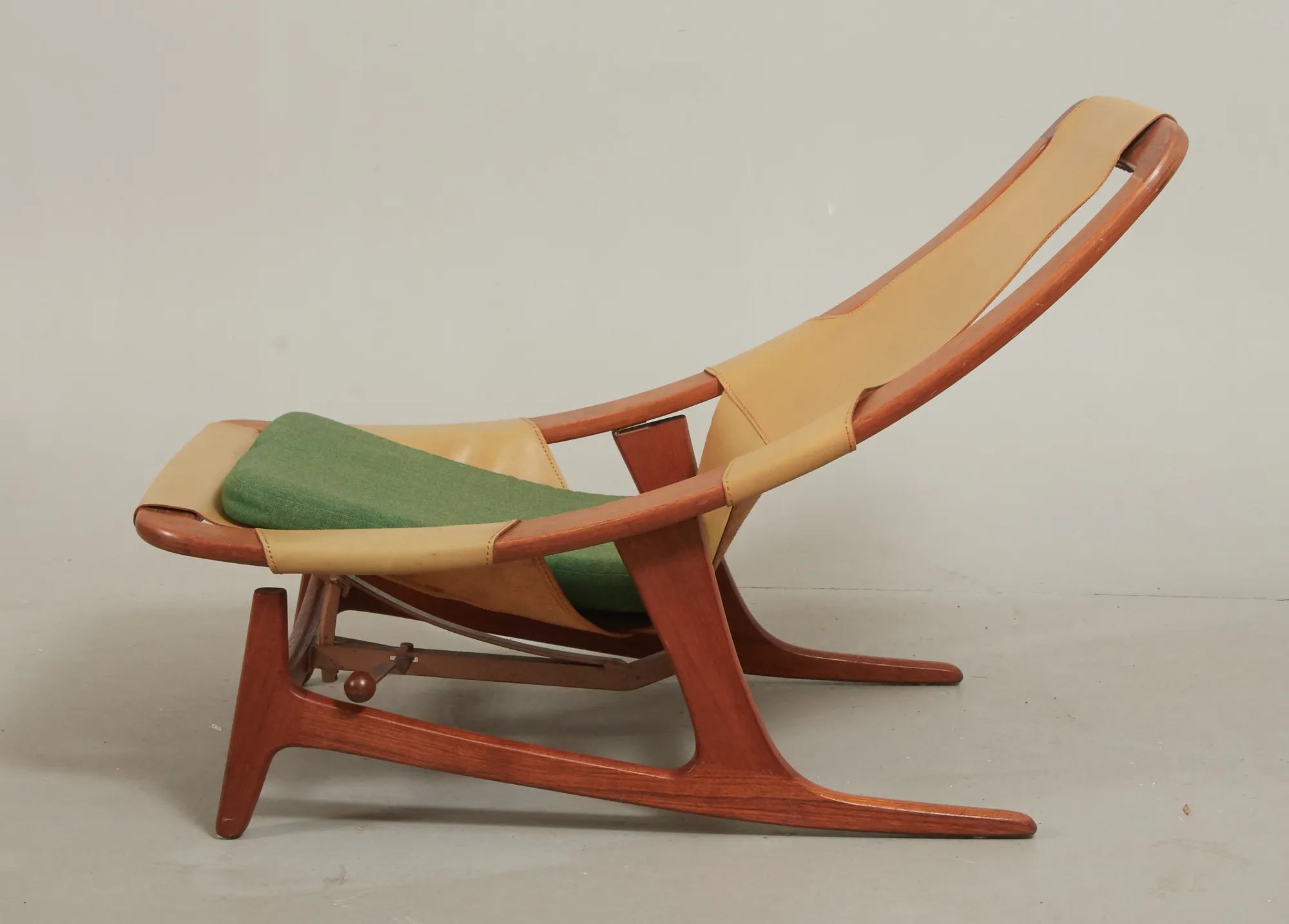Norge, 1960-tal, stomme i teak, sits i läder, lös textilklädd sittplymå, justerbar sits, bruksslitage.
