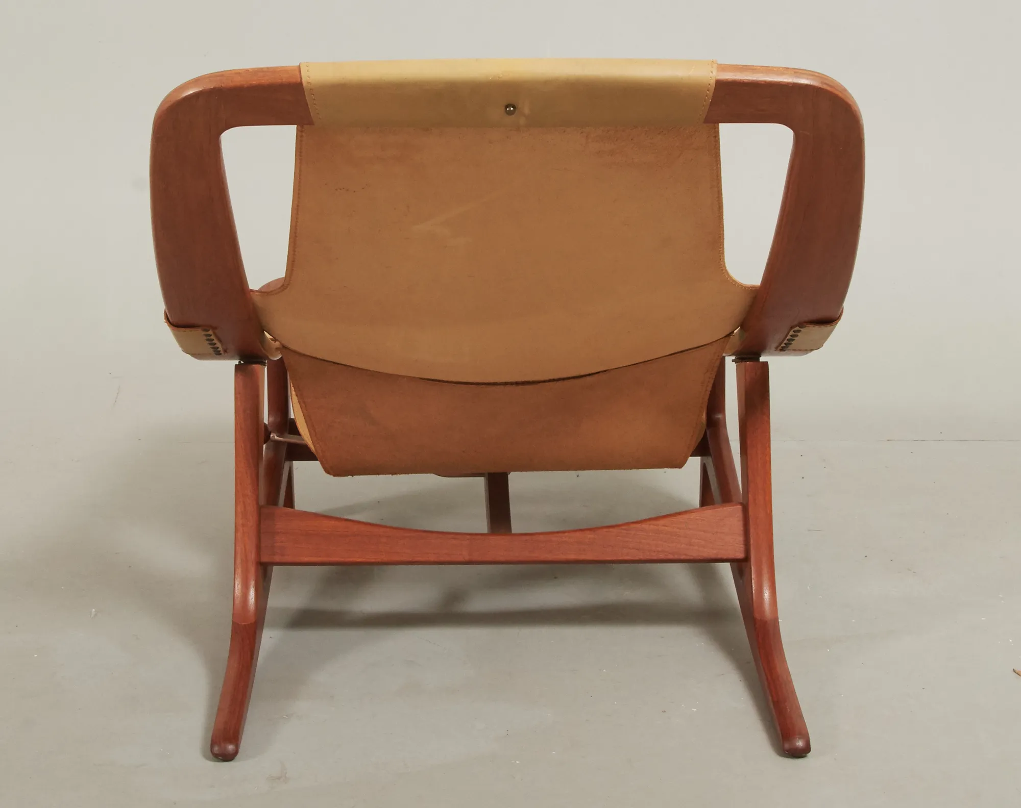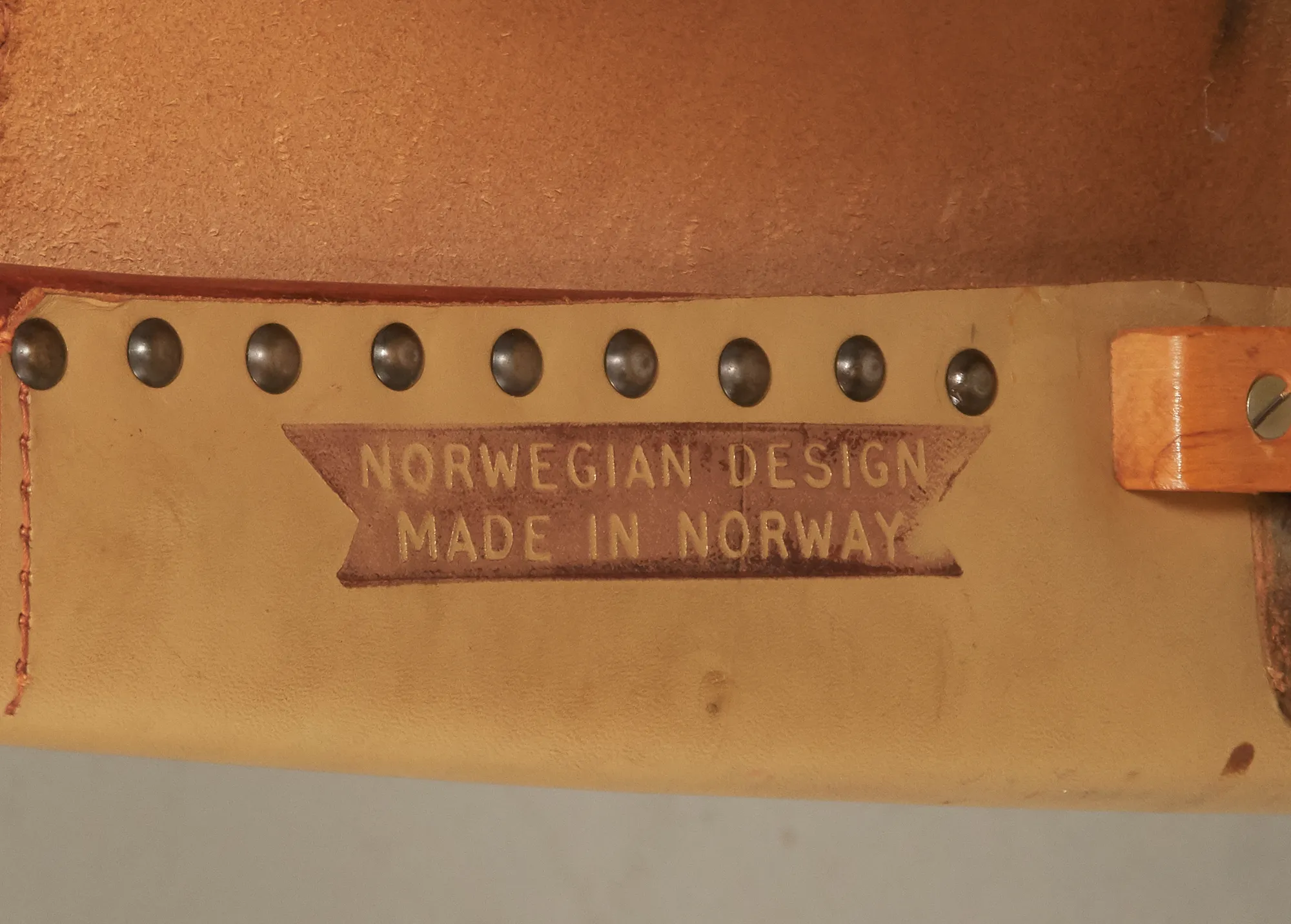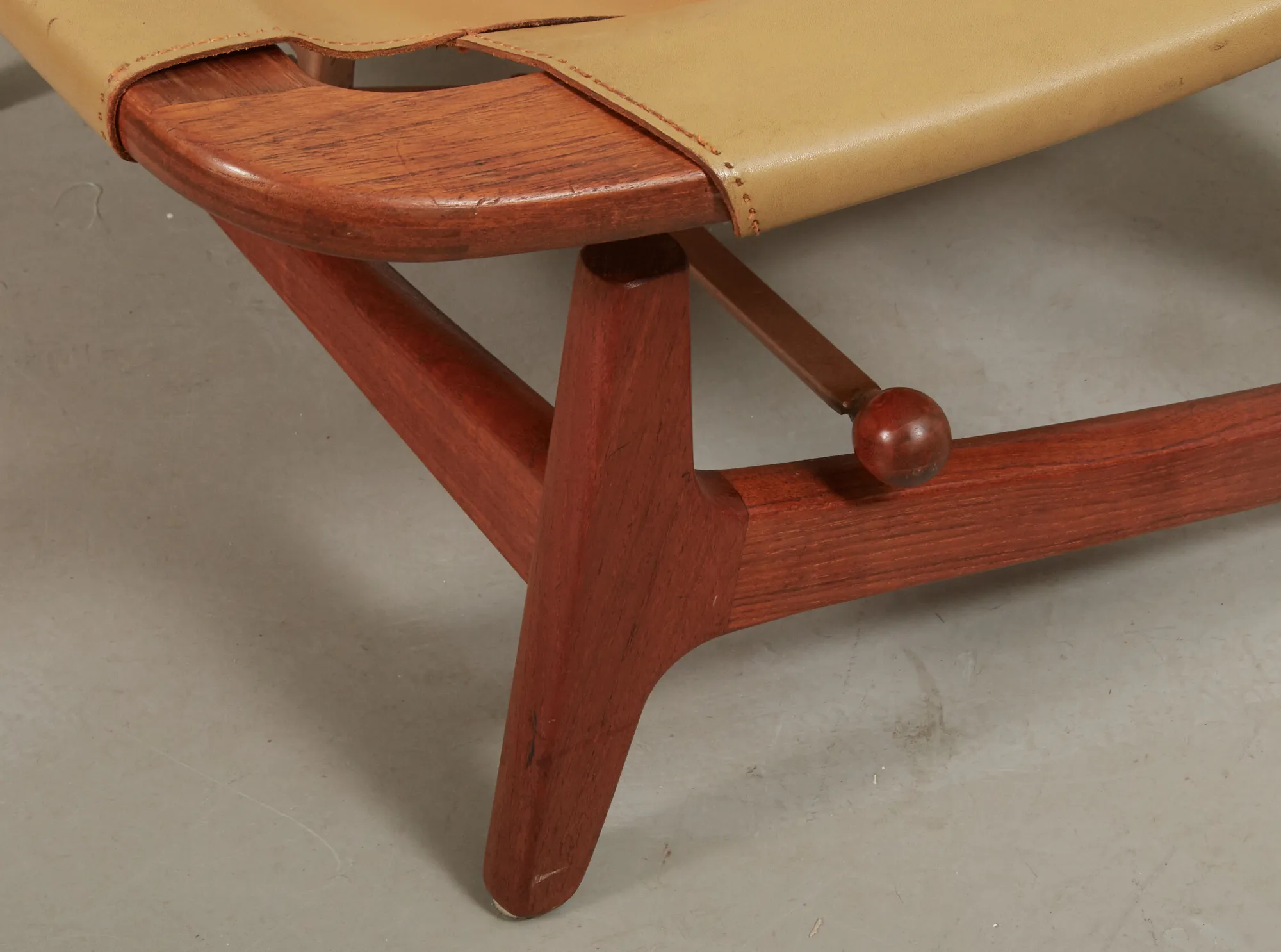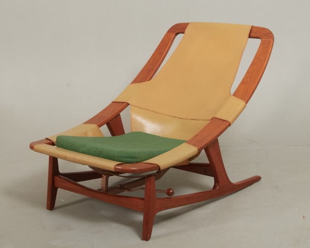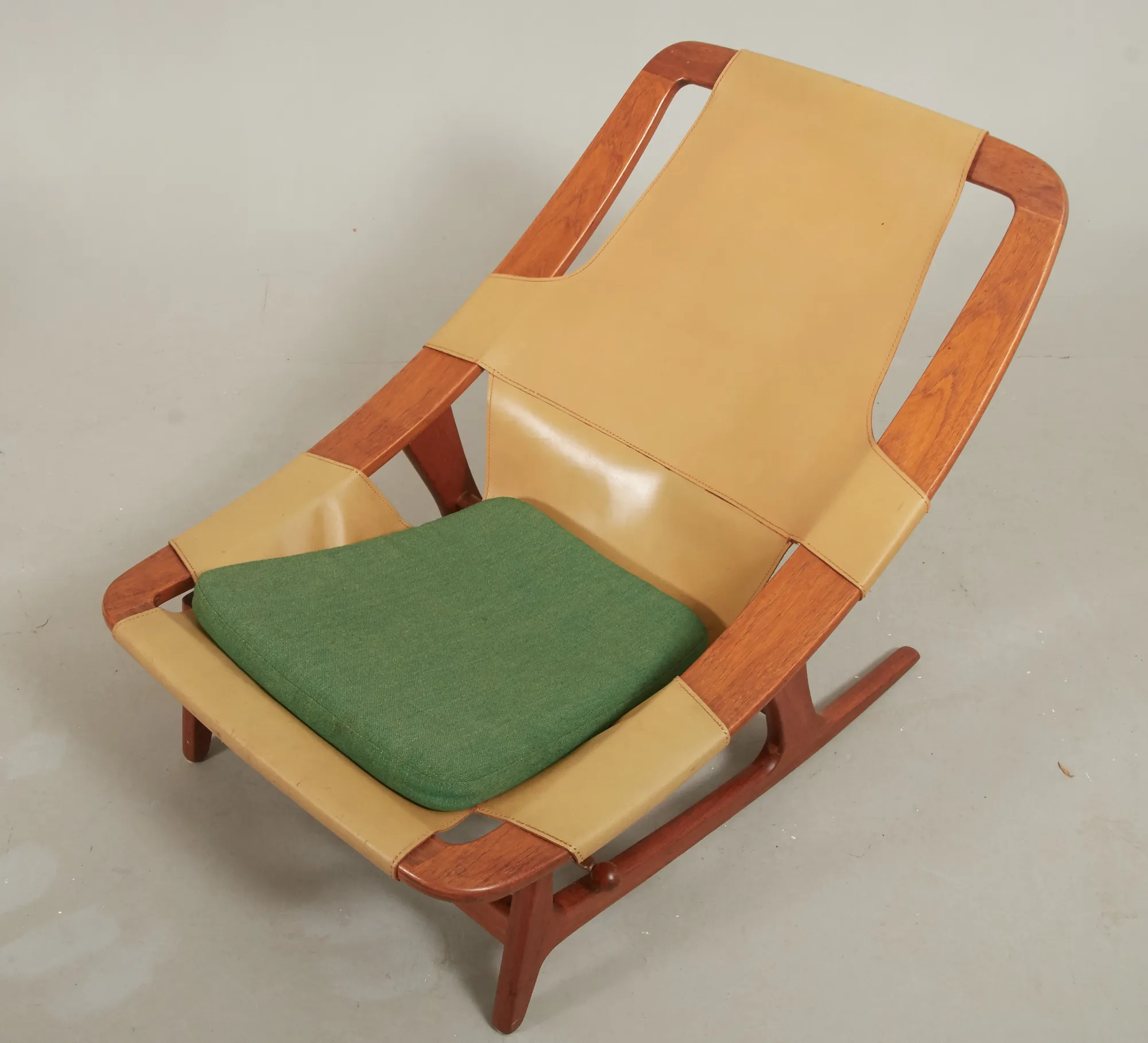 Norge, 1960-tal, stomme i teak, sits i läder, lös textilklädd sittplymå, justerbar sits, bruksslitage.