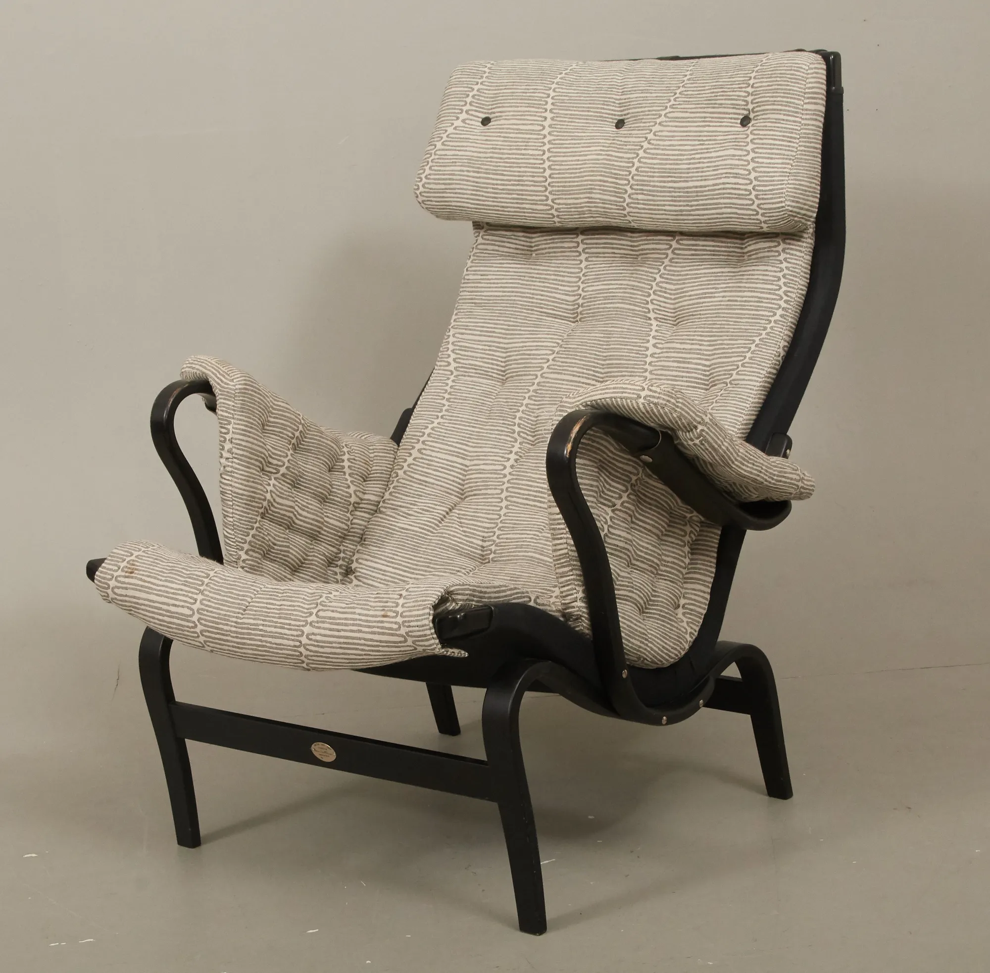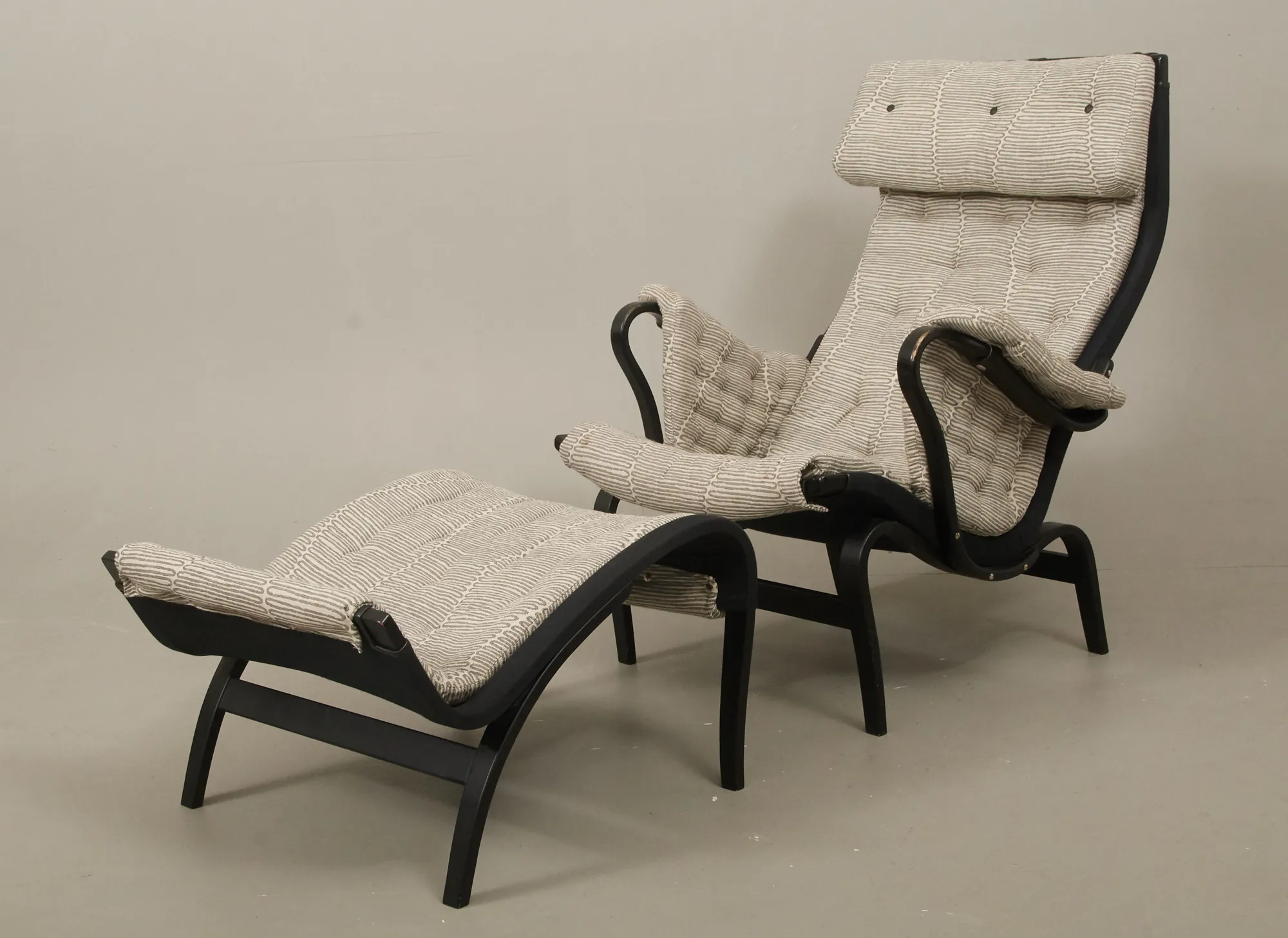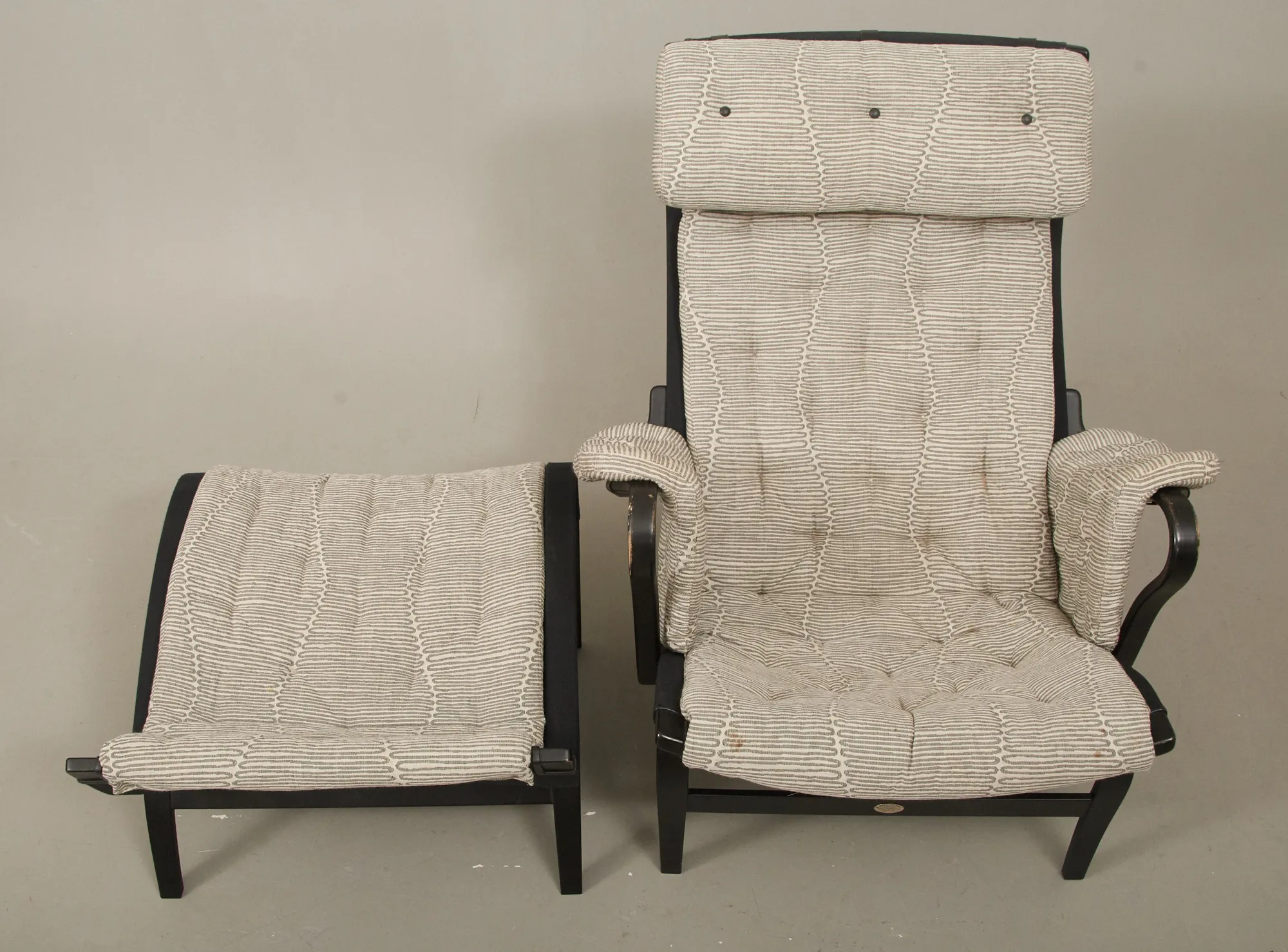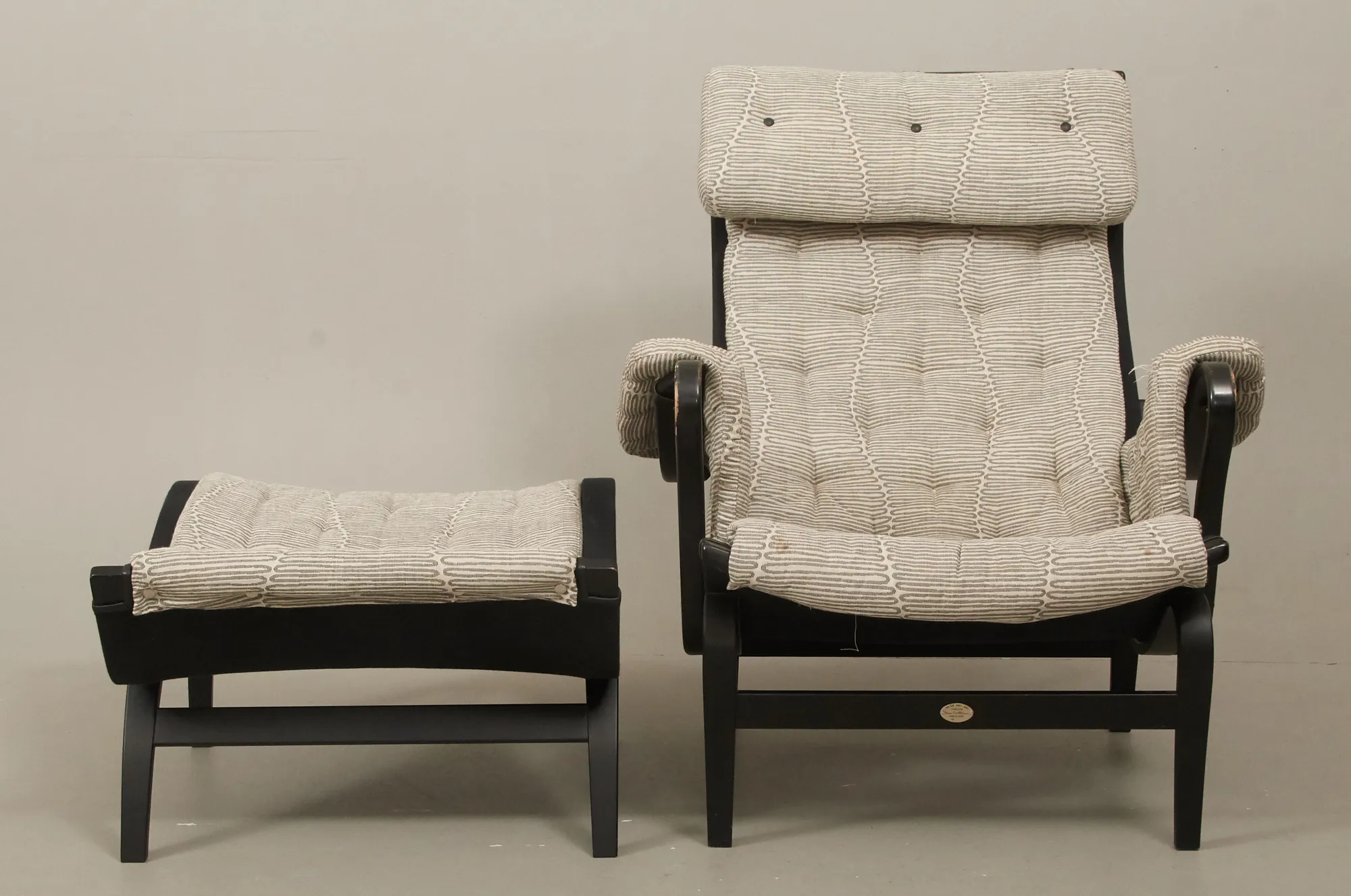 Tillverkad 2007 för DUX 100 års-jubileum, svartlackerat trä, med textilklädsel, brickmärkt, fotpall medföljer, smärre bruksslitage, men ett armlän med mindre slitage.