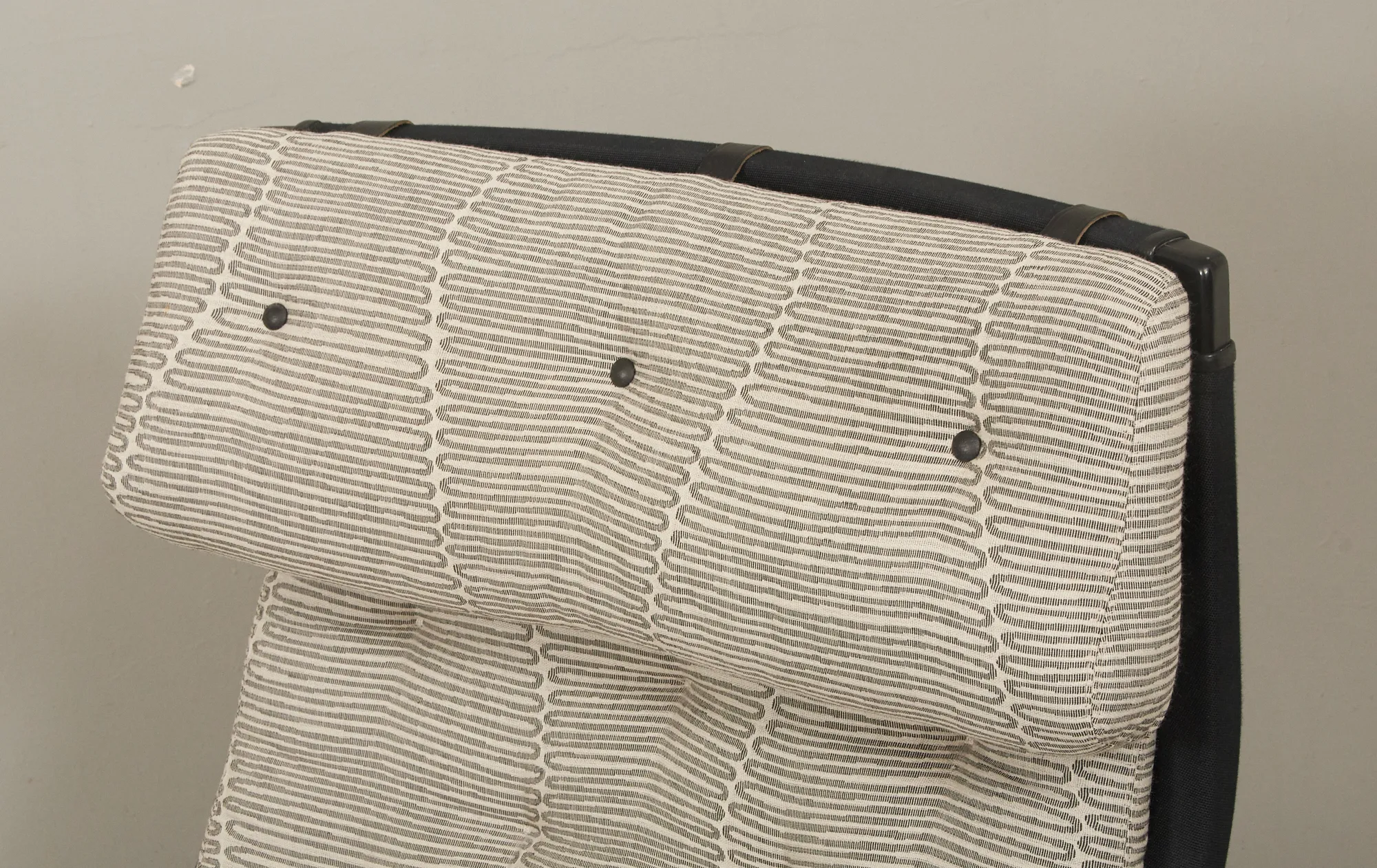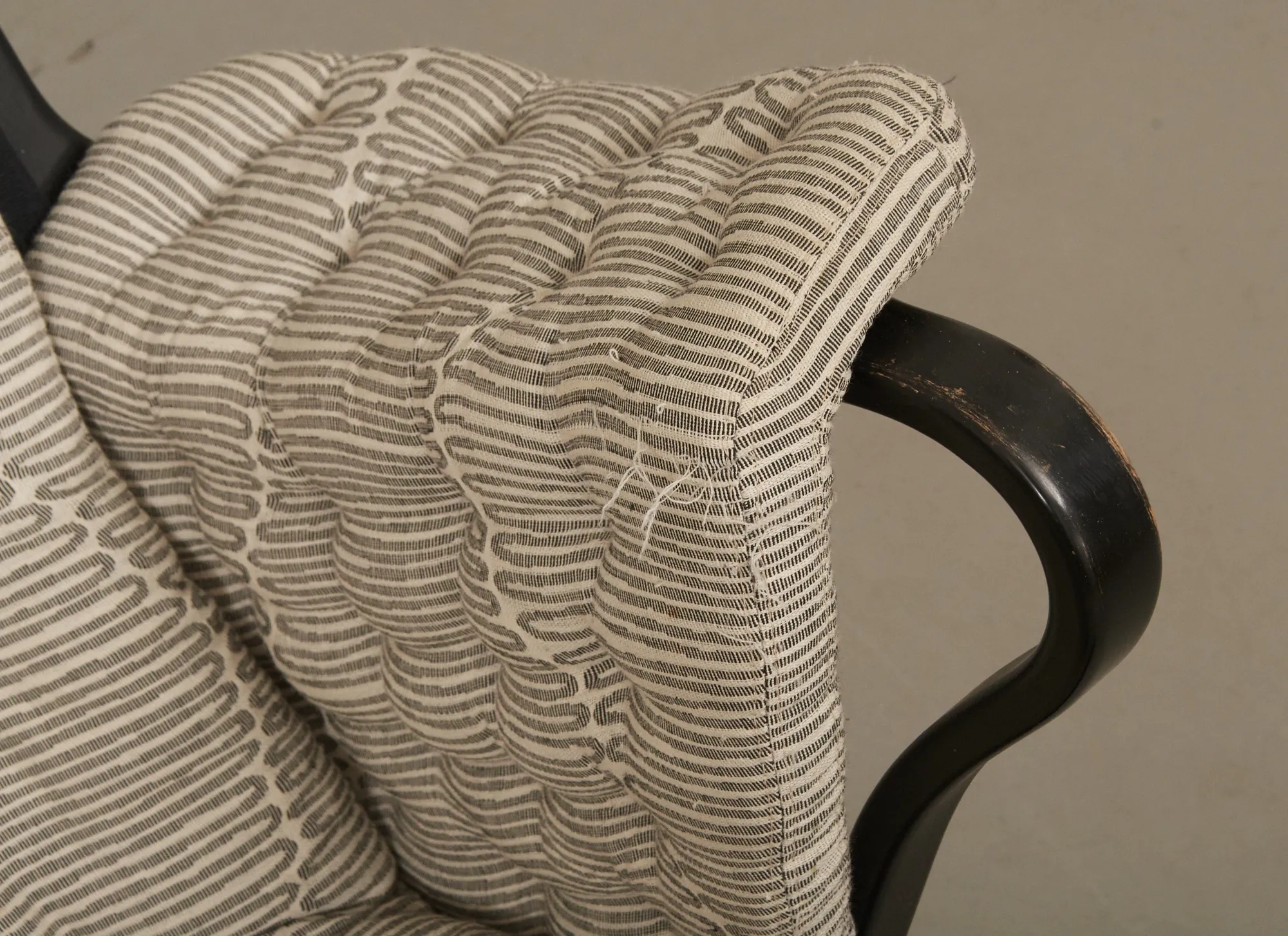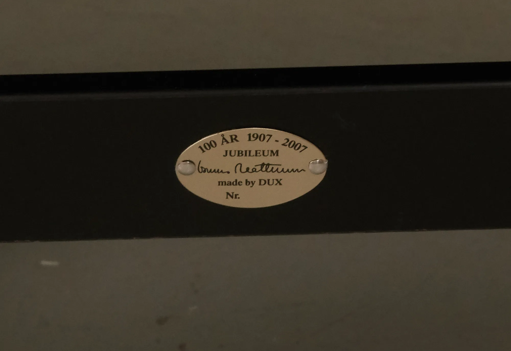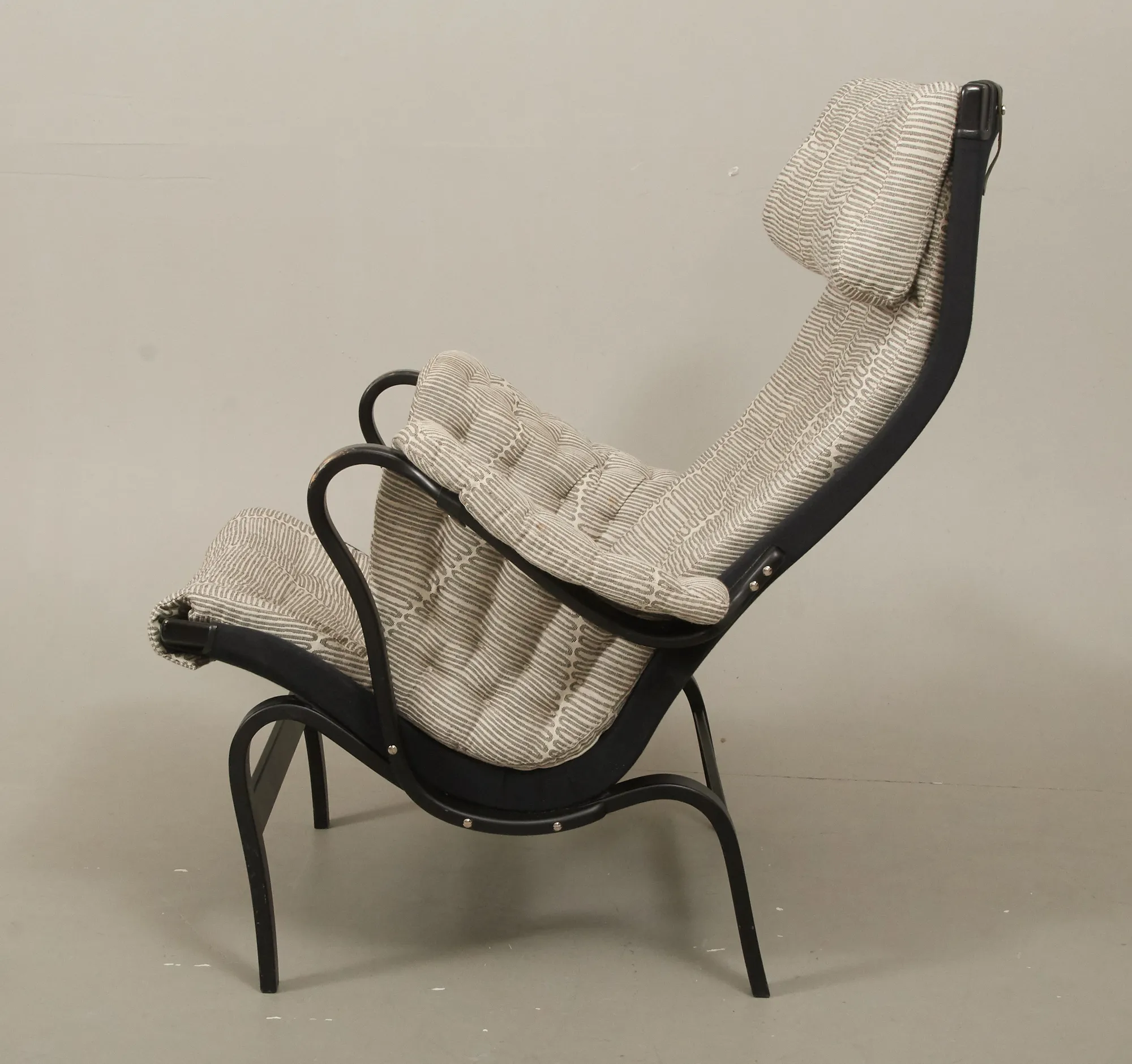 Tillverkad 2007 för DUX 100 års-jubileum, svartlackerat trä, med textilklädsel, brickmärkt, fotpall medföljer, smärre bruksslitage, men ett armlän med mindre slitage.