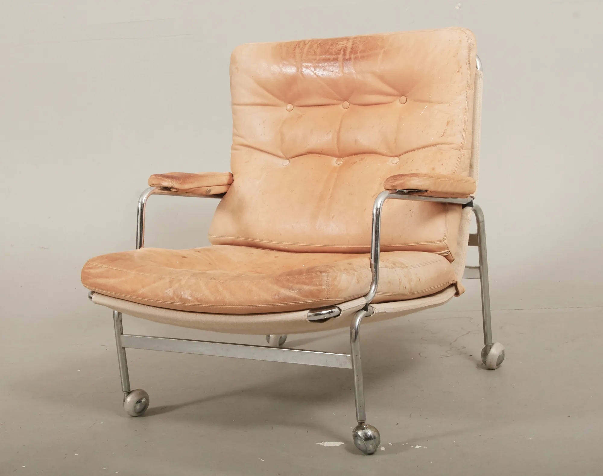 Stomme i kromad metall, kanvas, med lösa läderklädda plymåer, bruksslitage, ett avvikande hjul, läder med smuts och fläckar.