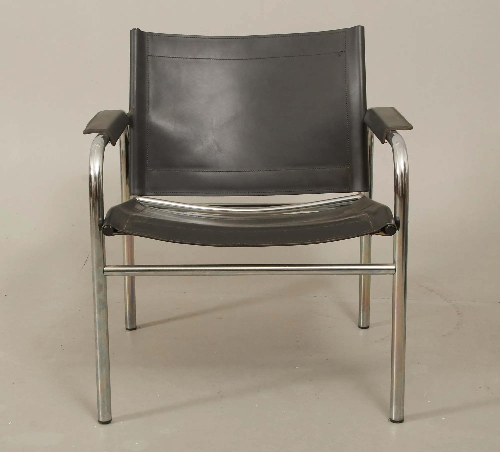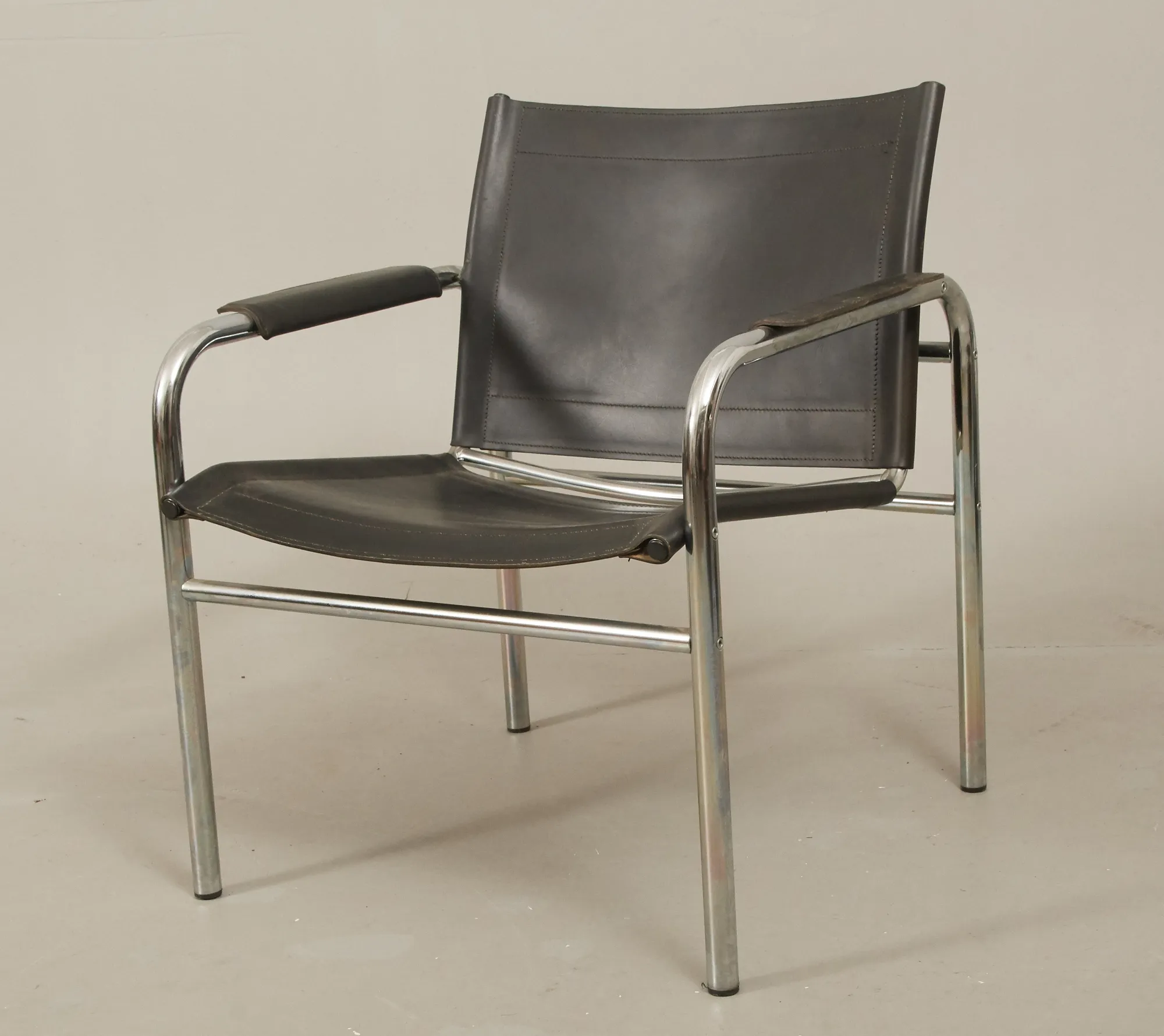 Klädsel i svart läder, kromad metallstomme. Läder med fläckar, repor .