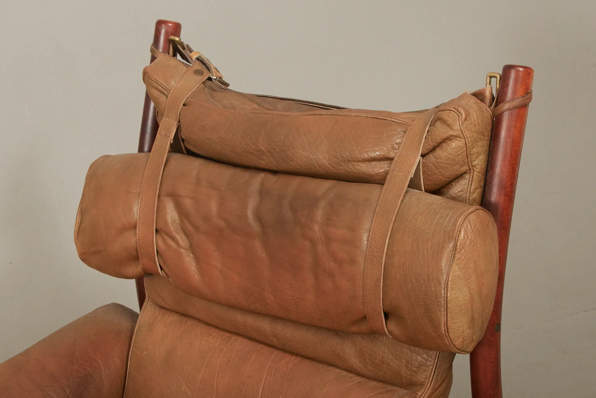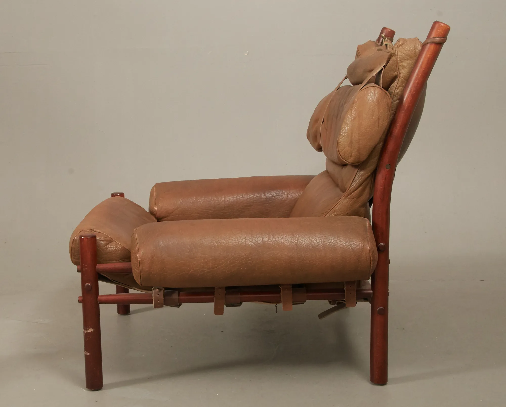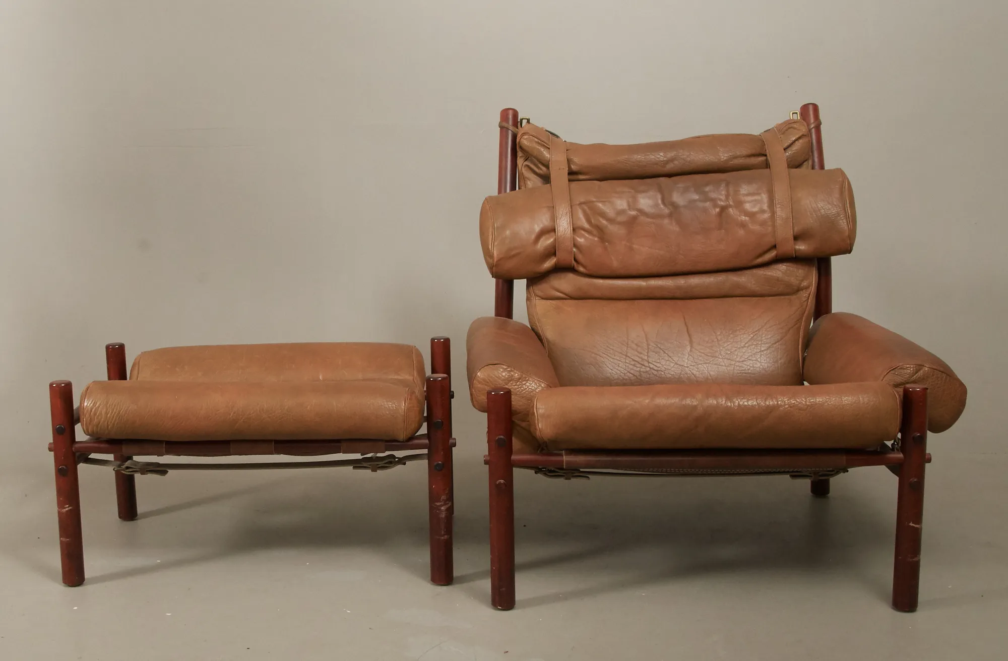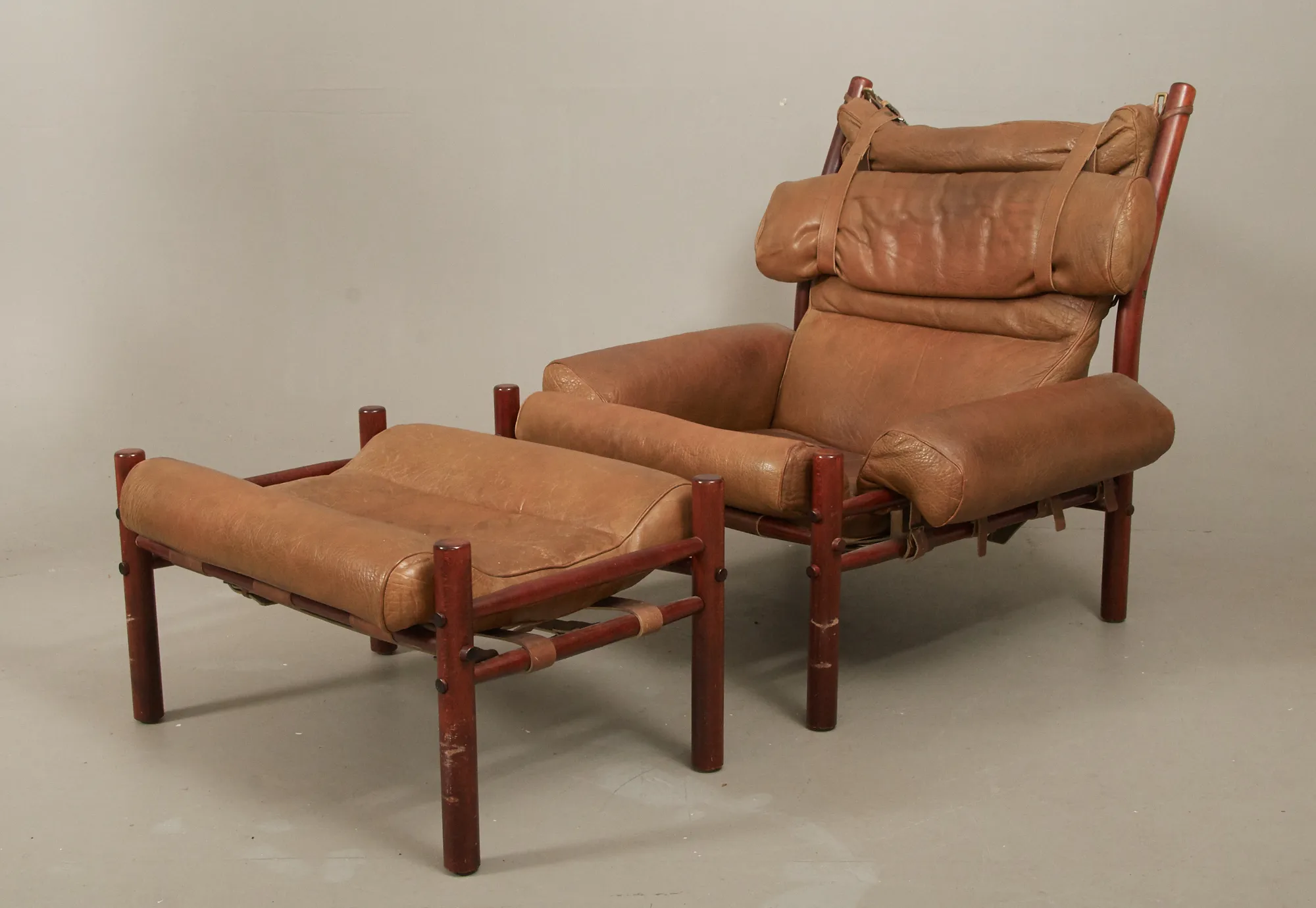 Stomme i betsad bok, klädsel i läder, fotpall medföljer, bruksslitage.