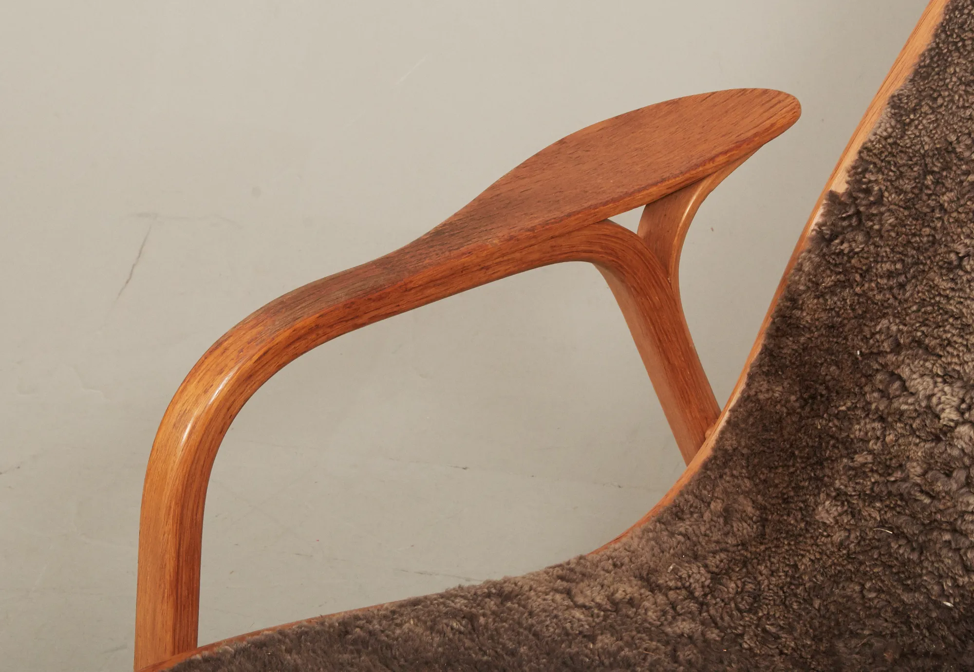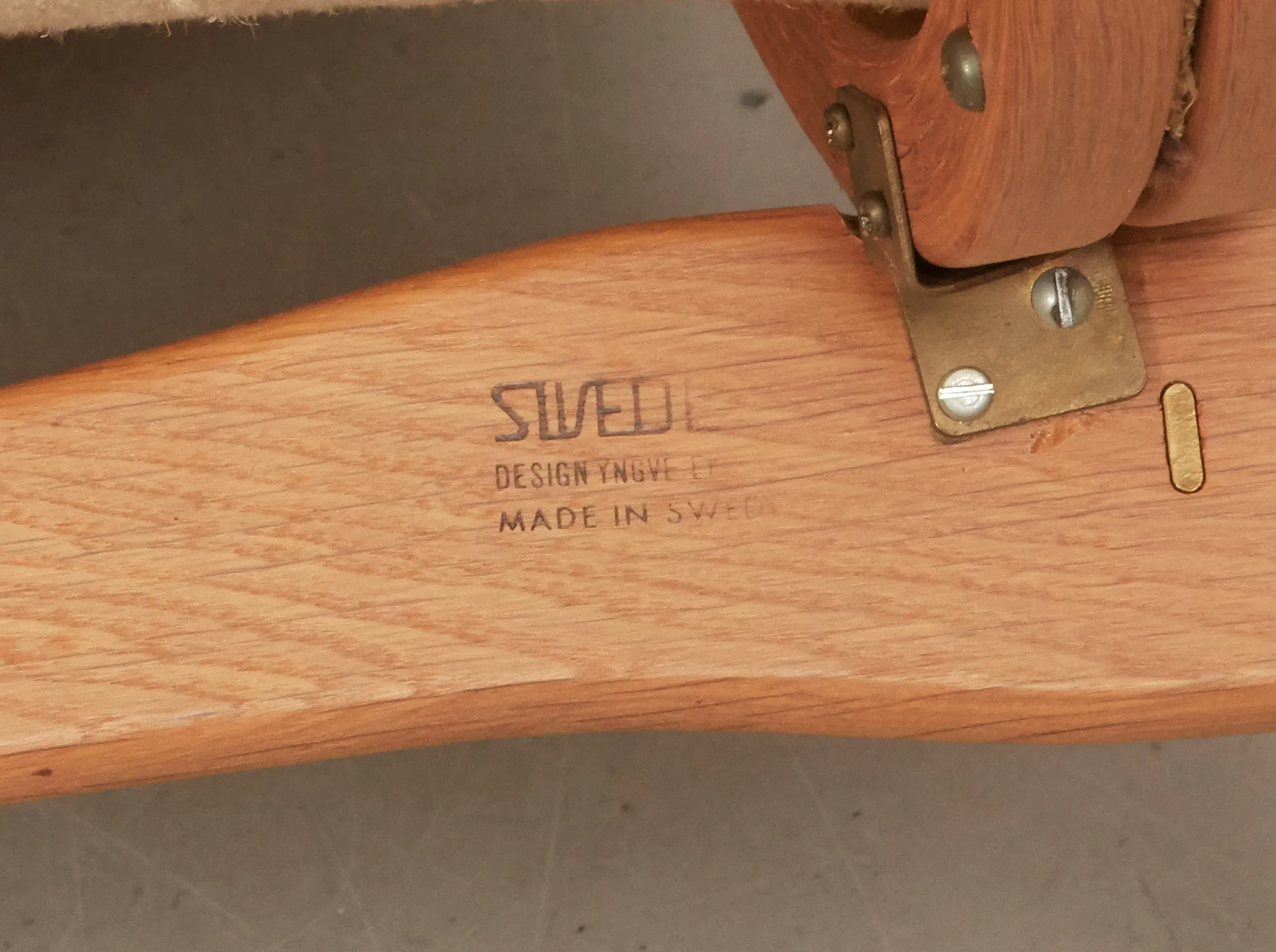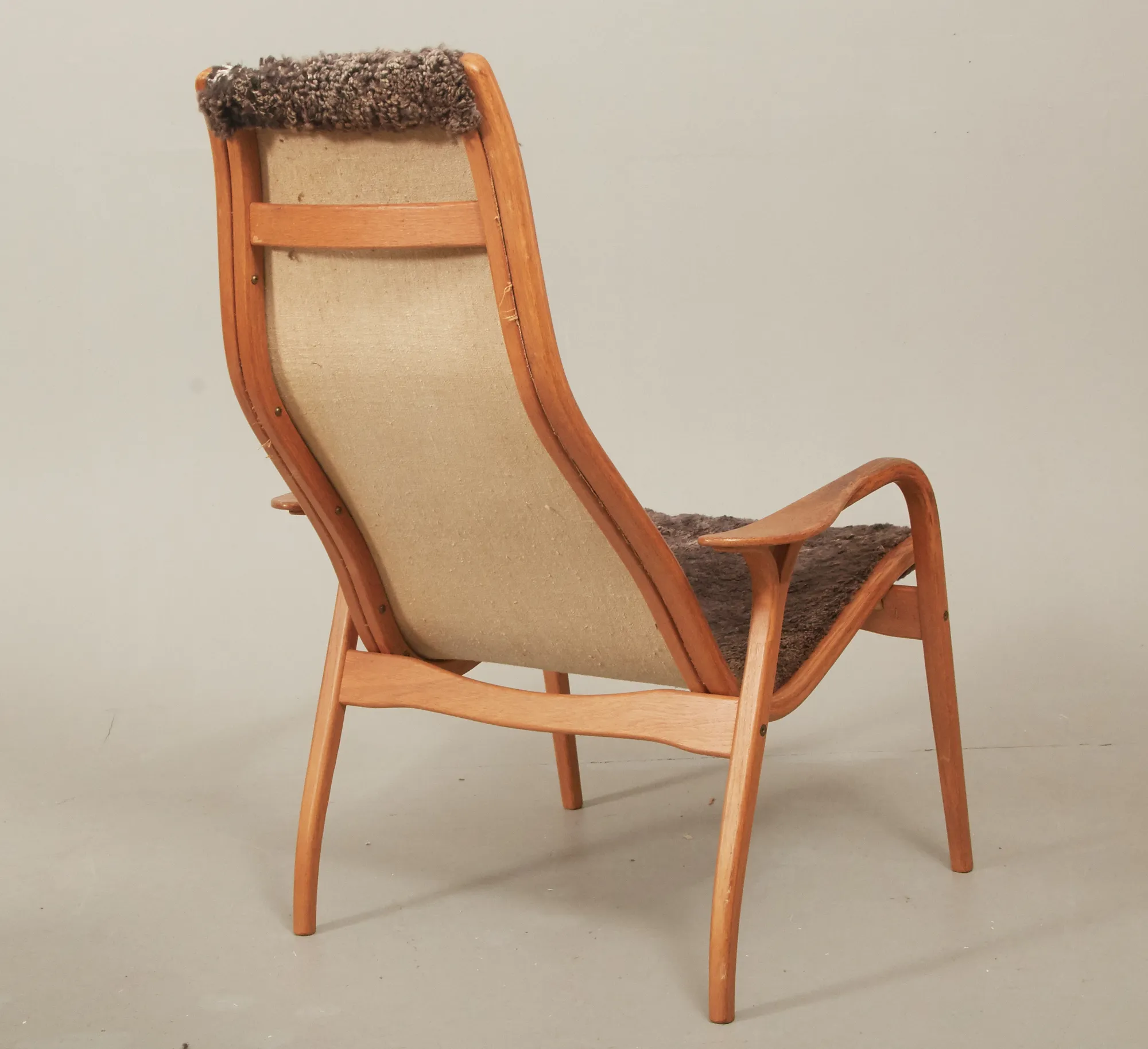Ek, med klädsel i fårskinn, brännstämplad, bruksslitage, klädsel med ställvis slitage, pall med kraftigt slitage.
